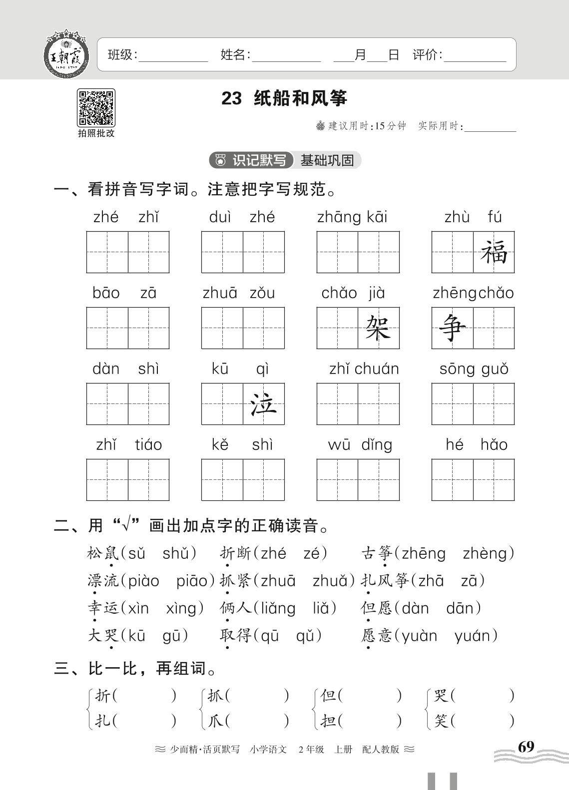 2024秋上册二年级语文人教版 第八单元——23. 纸船和风筝