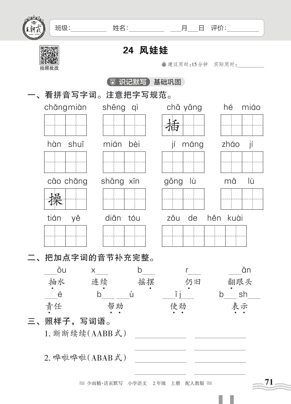 2024秋上册二年级语文人教版 第八单元——24. 风娃娃