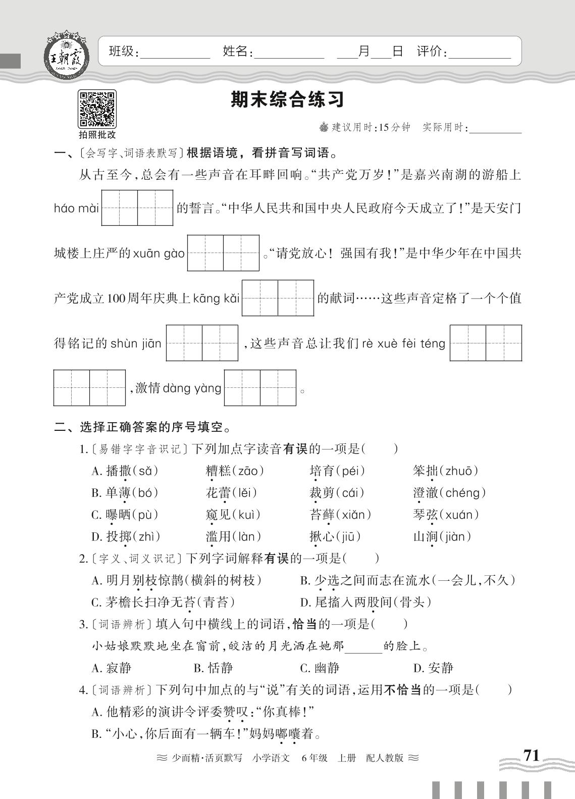 2024秋上册六年级语文人教版 期末综合练习(默写专练)