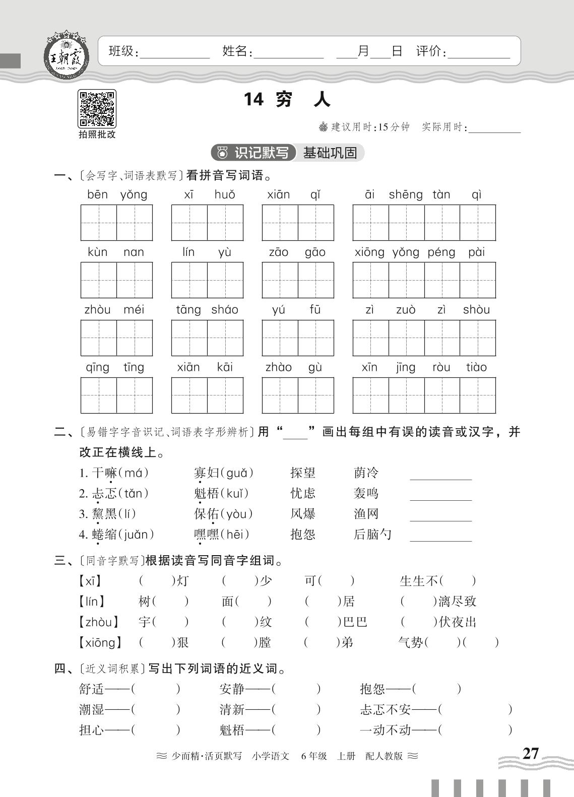 2024秋上册六年级语文人教版 第四单元——14. 穷人