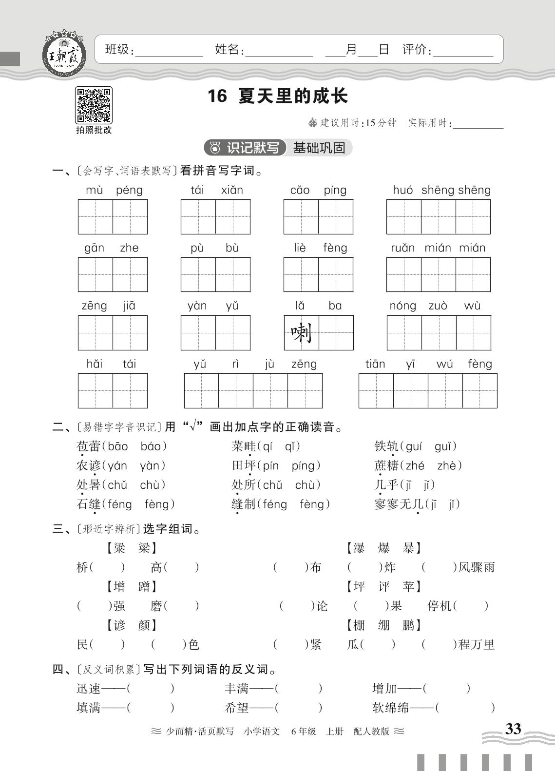 2024秋上册六年级语文人教版 第五单元——16. 夏天里的成长