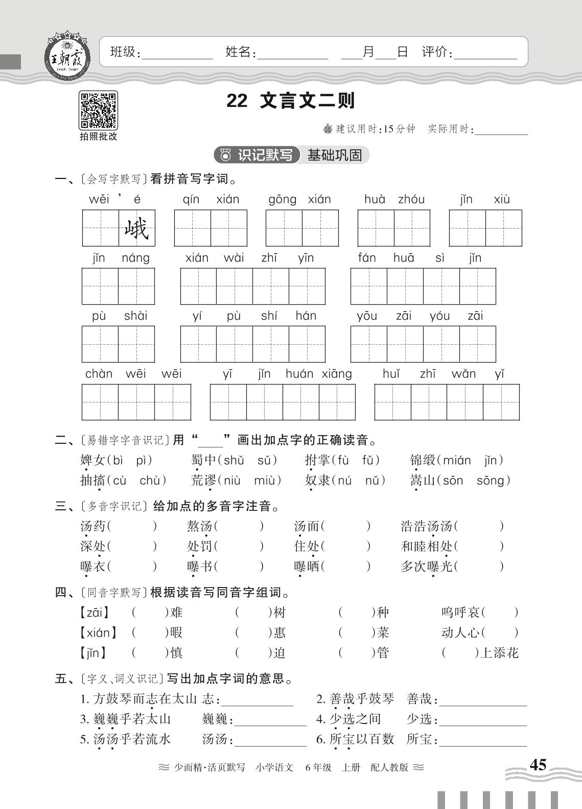 2024秋上册六年级语文人教版 第七单元——22. 文言文二则