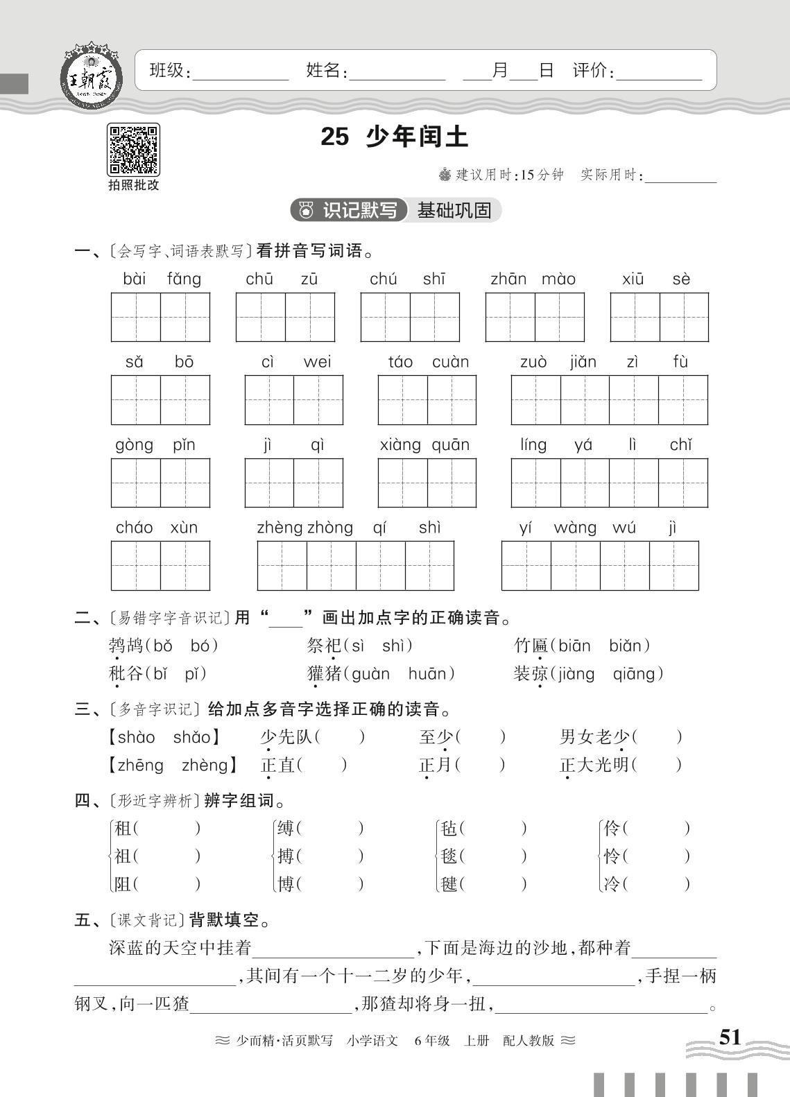 2024秋上册六年级语文人教版 第八单元——25. 少年闰土
