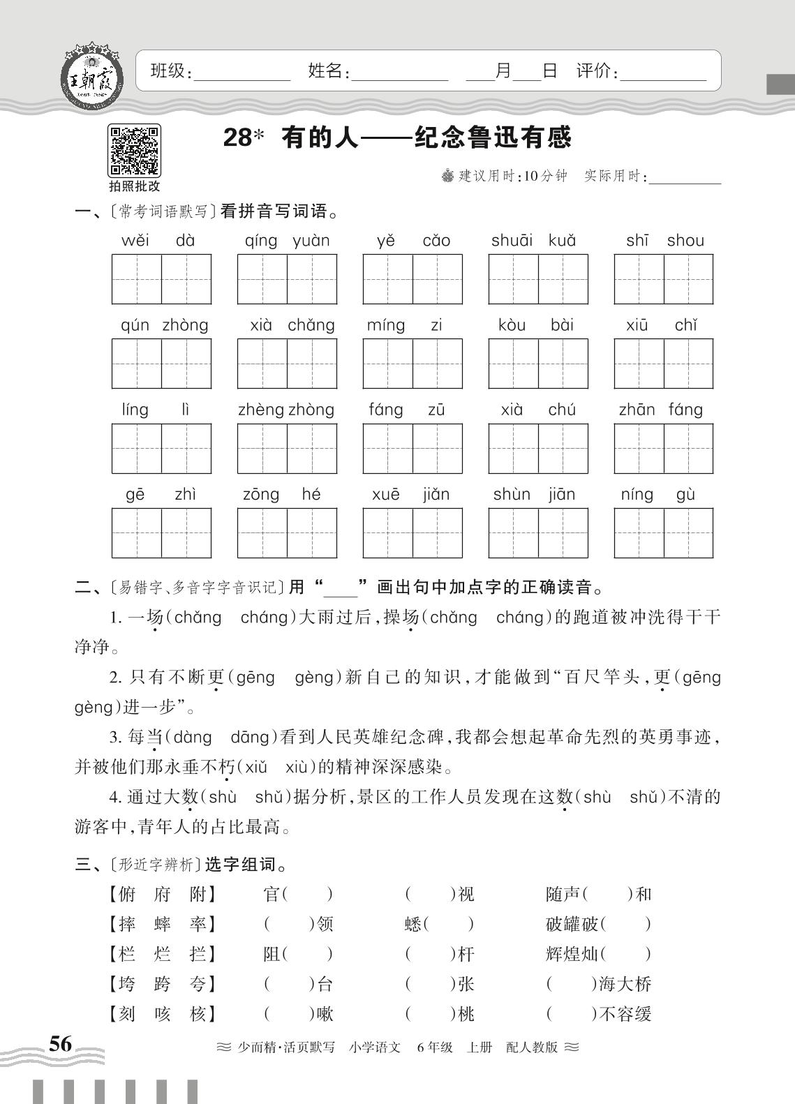 2024秋上册六年级语文人教版 第八单元——28. 有的人——纪念鲁迅有感
