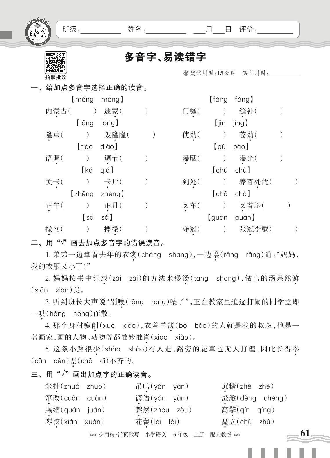 2024秋上册六年级语文人教版 期末专项练习——多音字、易读错字