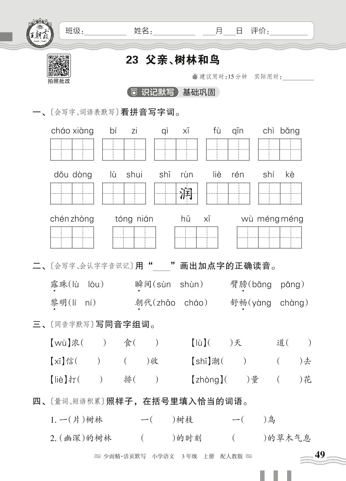 2024秋上册三年级语文人教版 第七单元——23. 父亲、树林和鸟