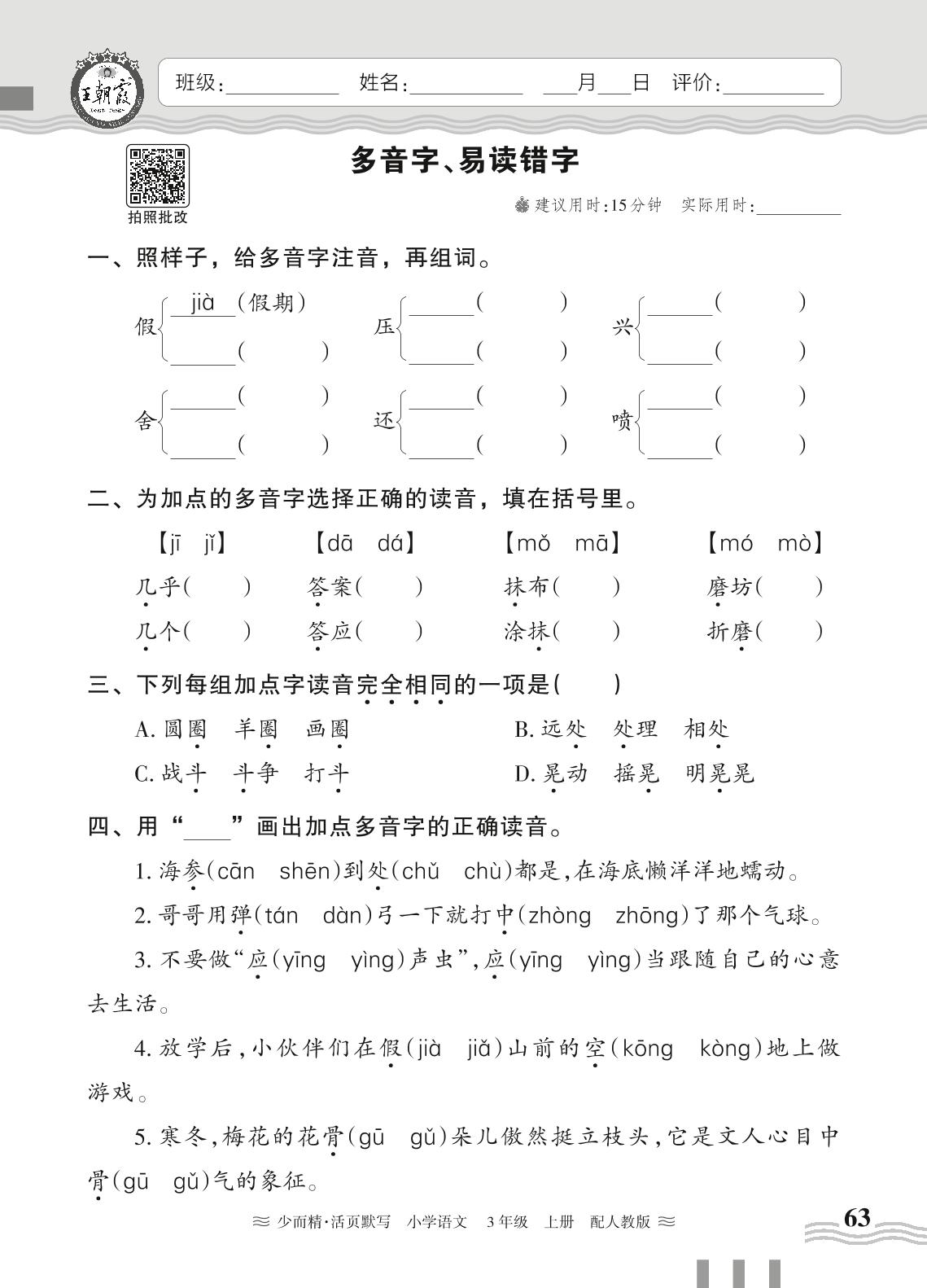 2024秋上册三年级语文人教版 期末专项练习——多音字、易读错字