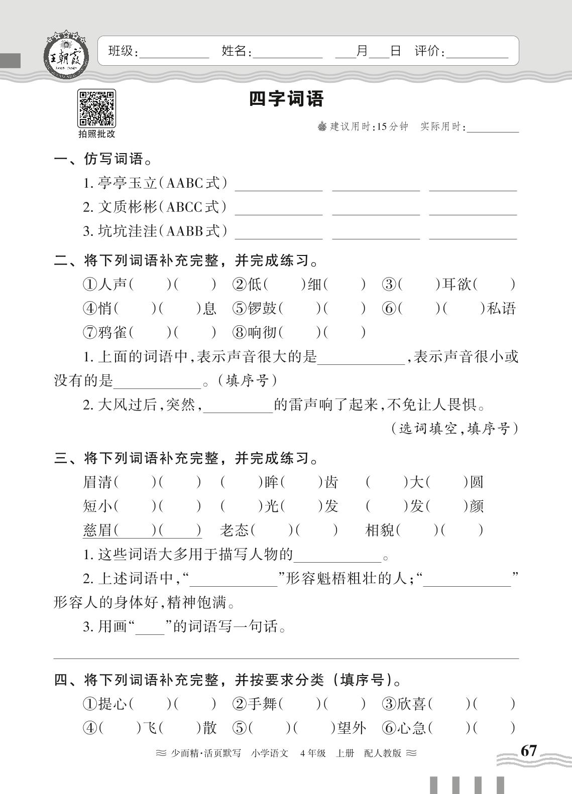 2024秋上册四年级语文人教版 期末专项练习——四字词语