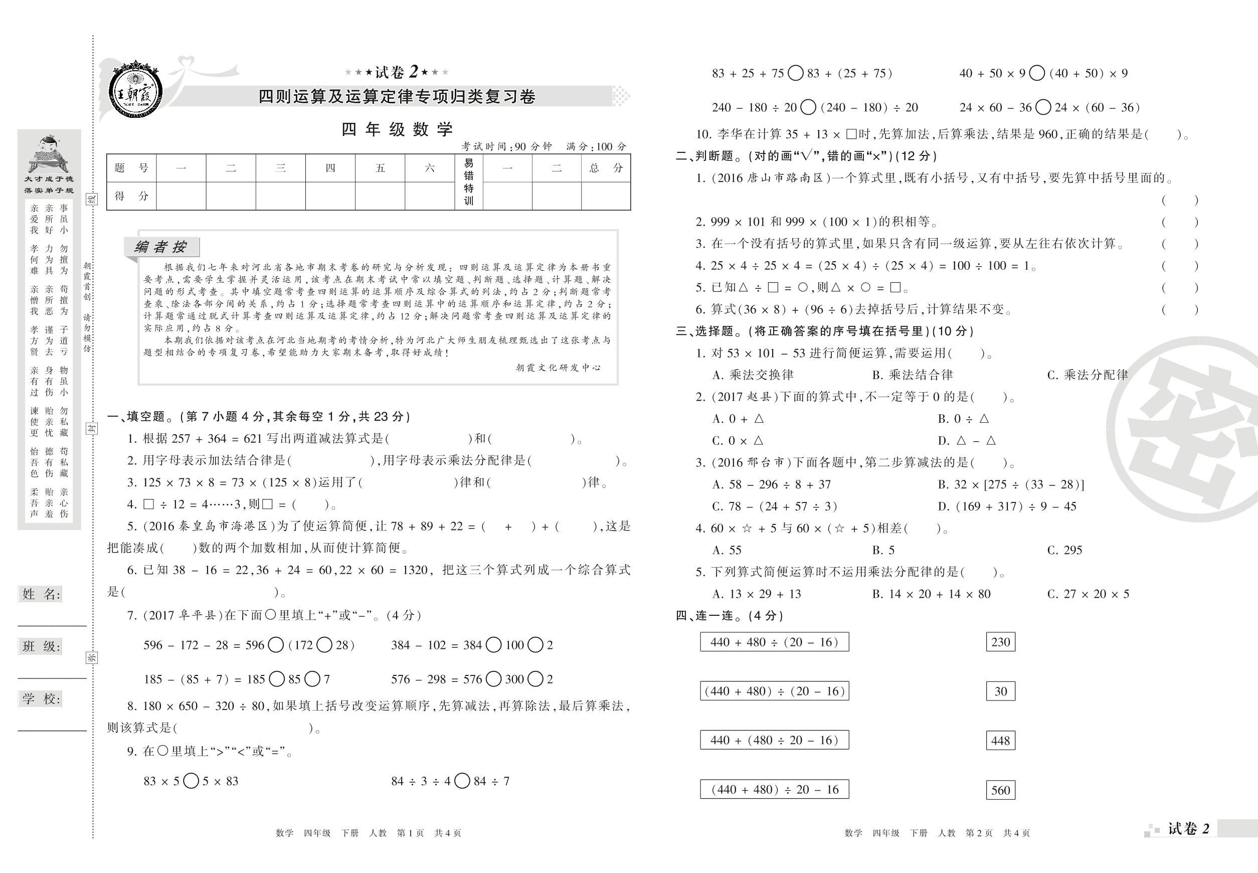王朝霞期末专项卷——四则运算及运算定律专项归类复习卷四年级下册数学(人教版)_R210804161108【2】