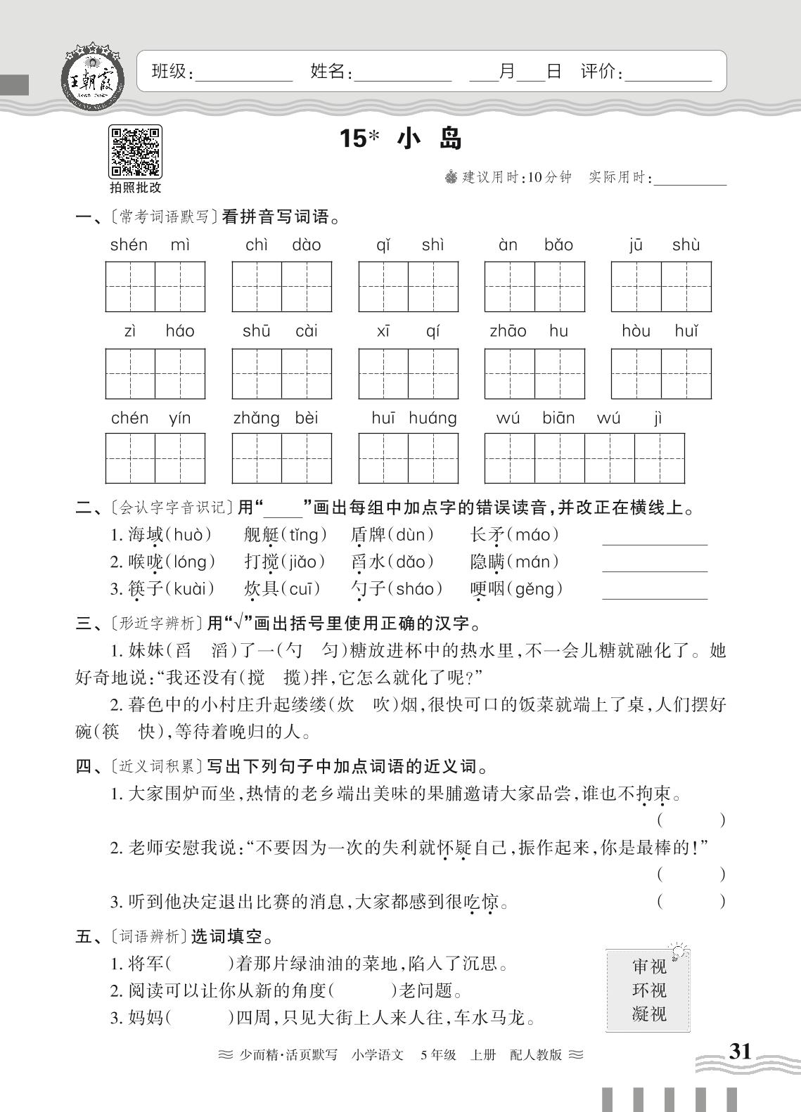 2024秋上册五年级语文人教版 第四单元——15. 小岛