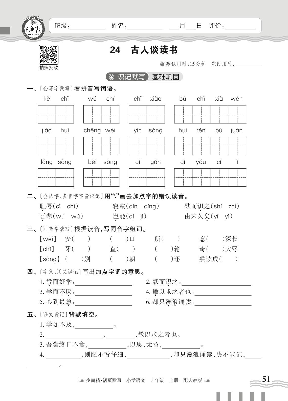 2024秋上册五年级语文人教版 第八单元——24. 古人谈读书