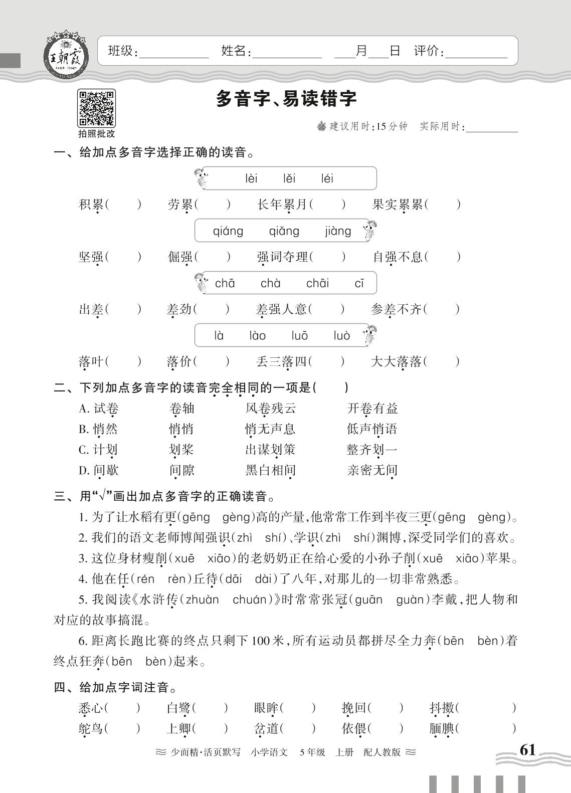 2024秋上册五年级语文人教版 期末专项练习——多音字、易读错字