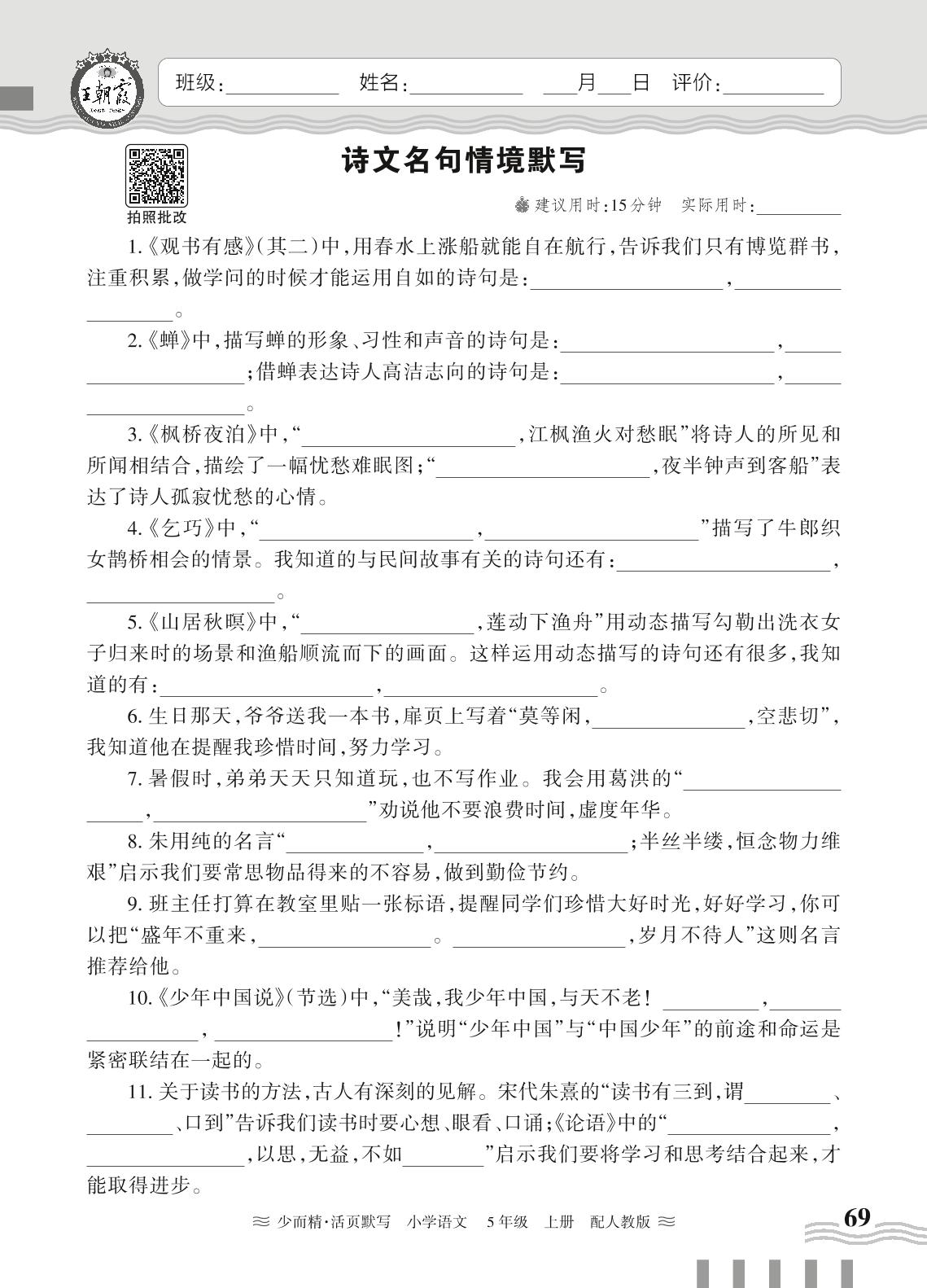 2024秋上册五年级语文人教版 期末专项练习——诗文名句情境默写