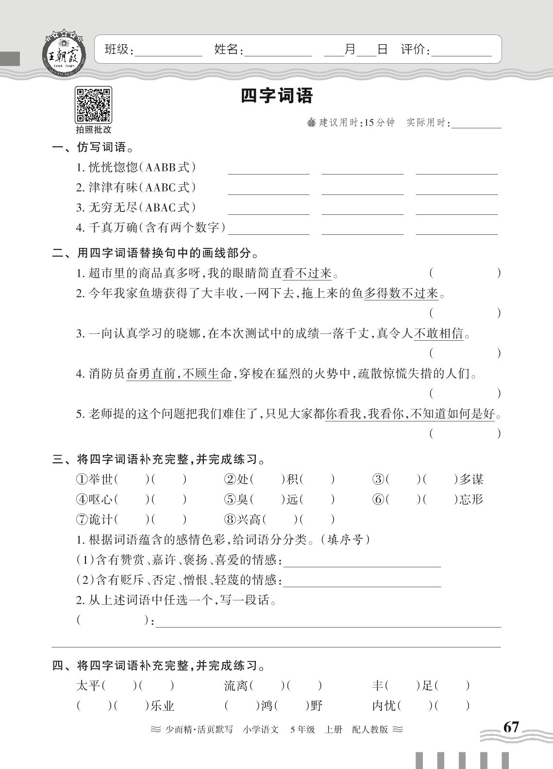 2024秋上册五年级语文人教版 期末专项练习——四字词语