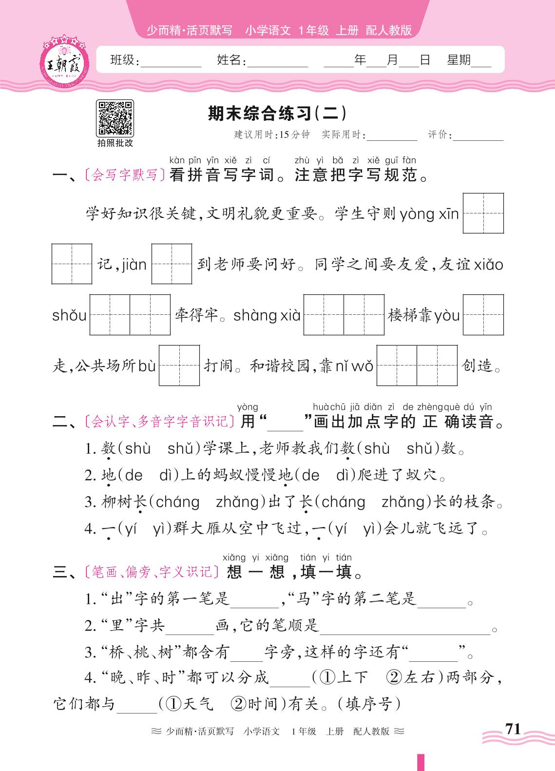 2024秋上册一年级语文人教版 期末综合练习(二)(默写专练)