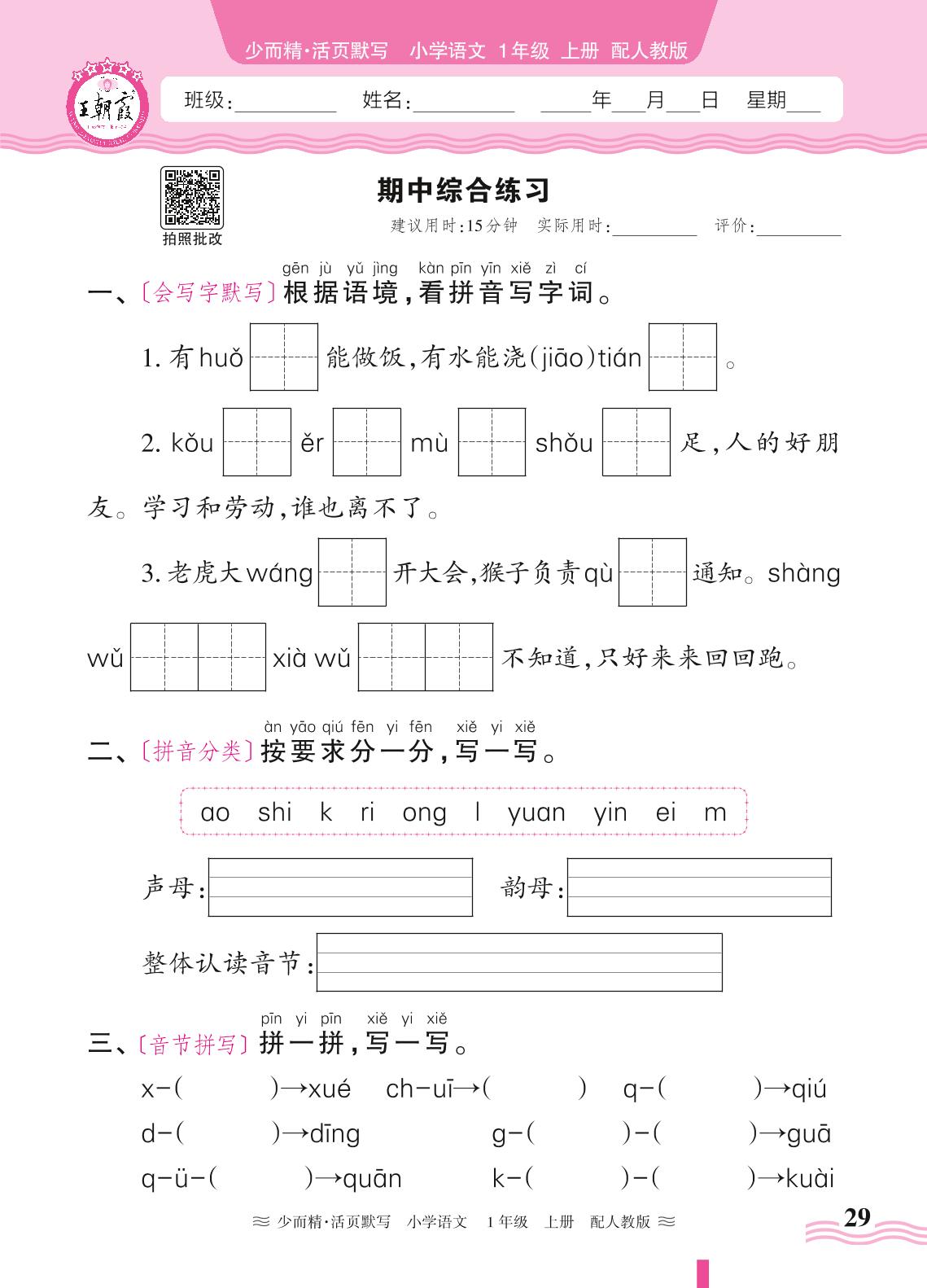 2024秋上册一年级语文人教版 期中综合练习(默写专练)