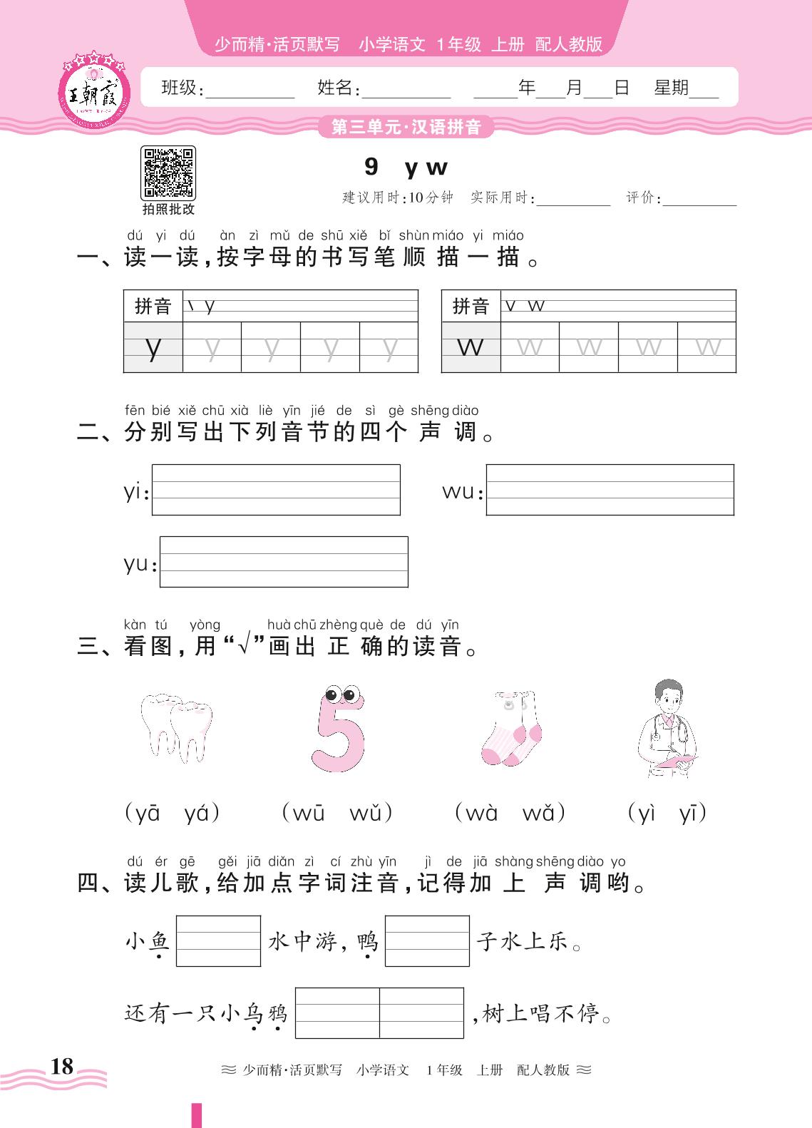 2024秋上册一年级语文人教版 第三单元 汉语拼音——9. y w_R240820152611329