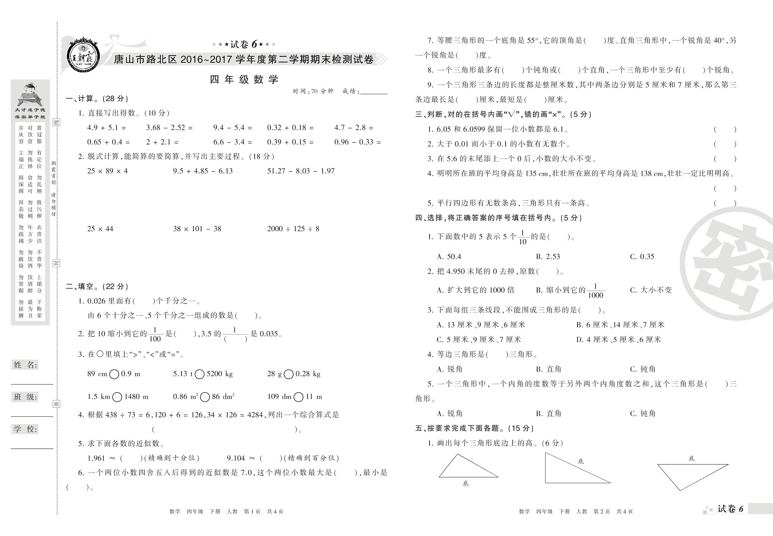 2016-2017学年第二学期唐山市路北区四年级数学试卷(人教版)【6】
