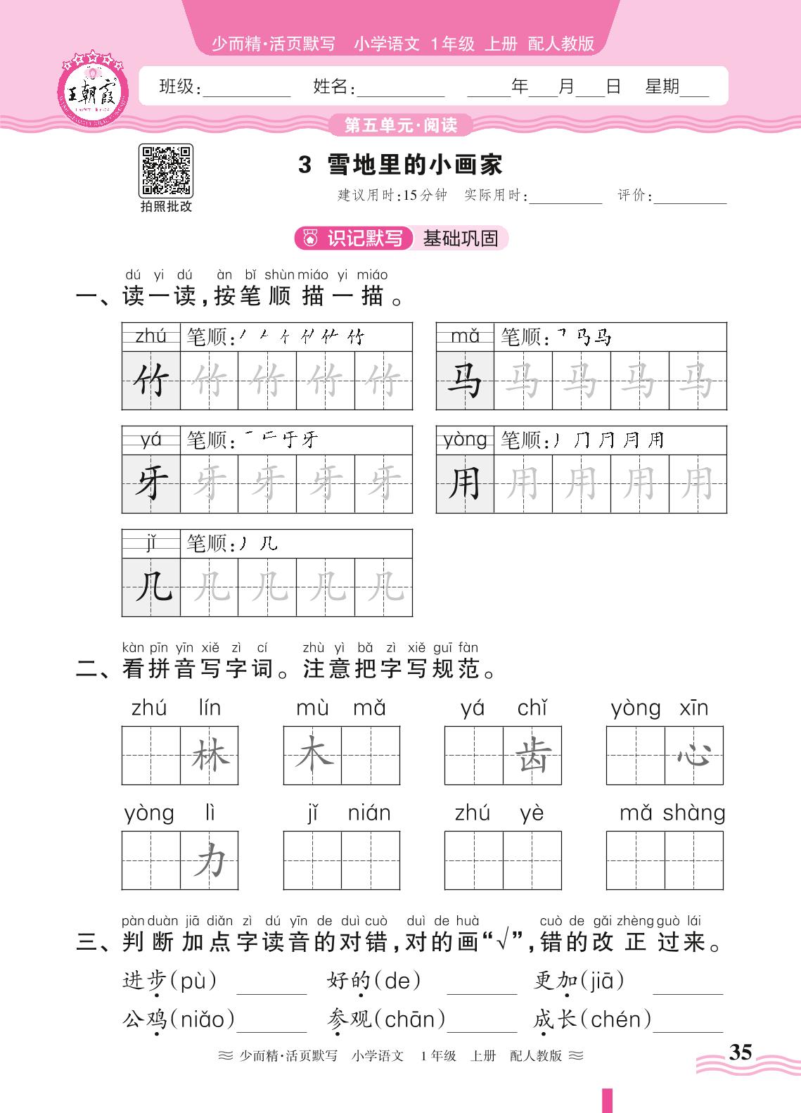 2024秋上册一年级语文人教版 第五单元 阅读——3. 雪地里的小画家_R240820152615249