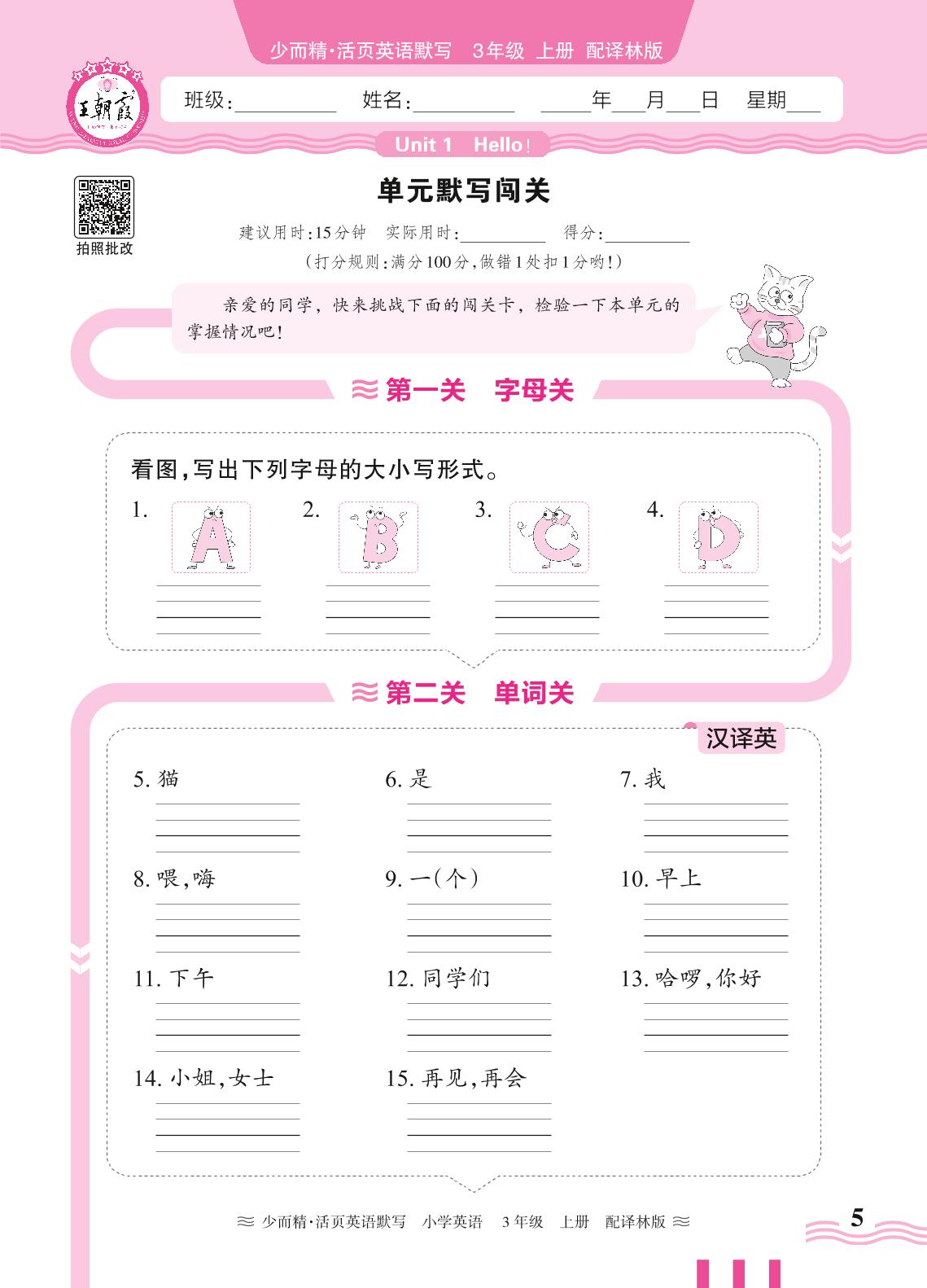 2024秋上册三年级英语译林版(三起始) Unit 1 单元默写闯关