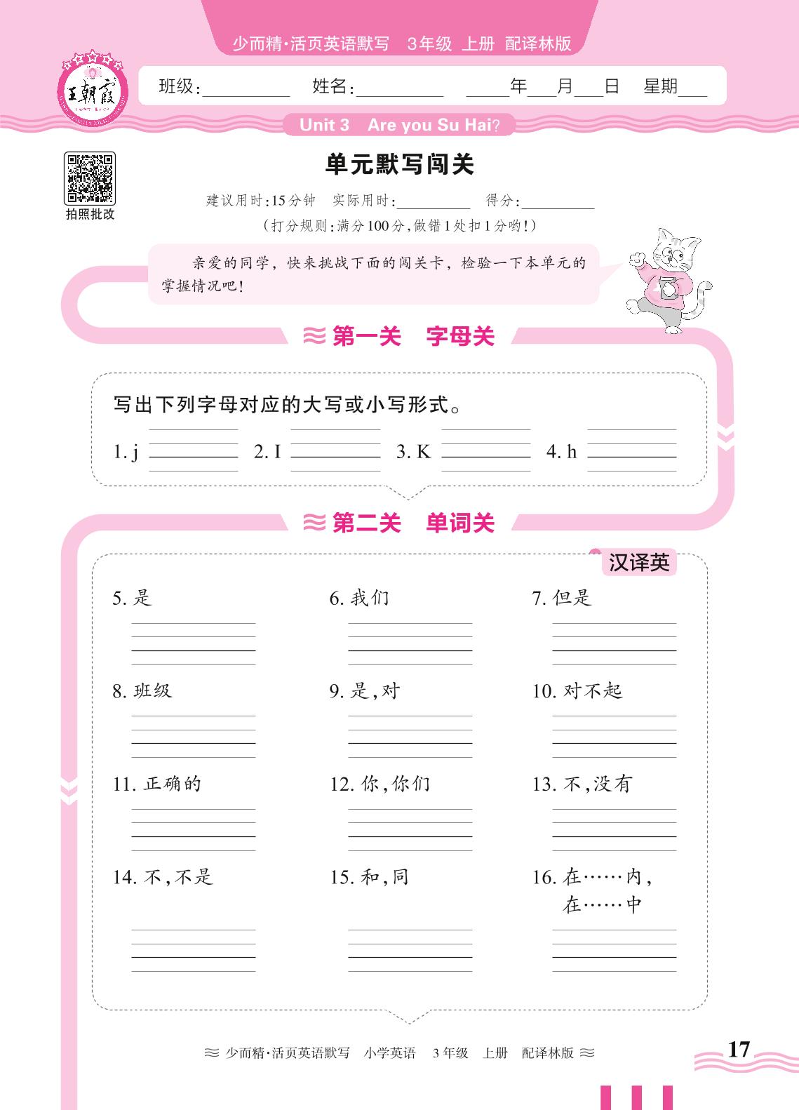 2024秋上册三年级英语译林版(三起始) Unit 3 单元默写闯关