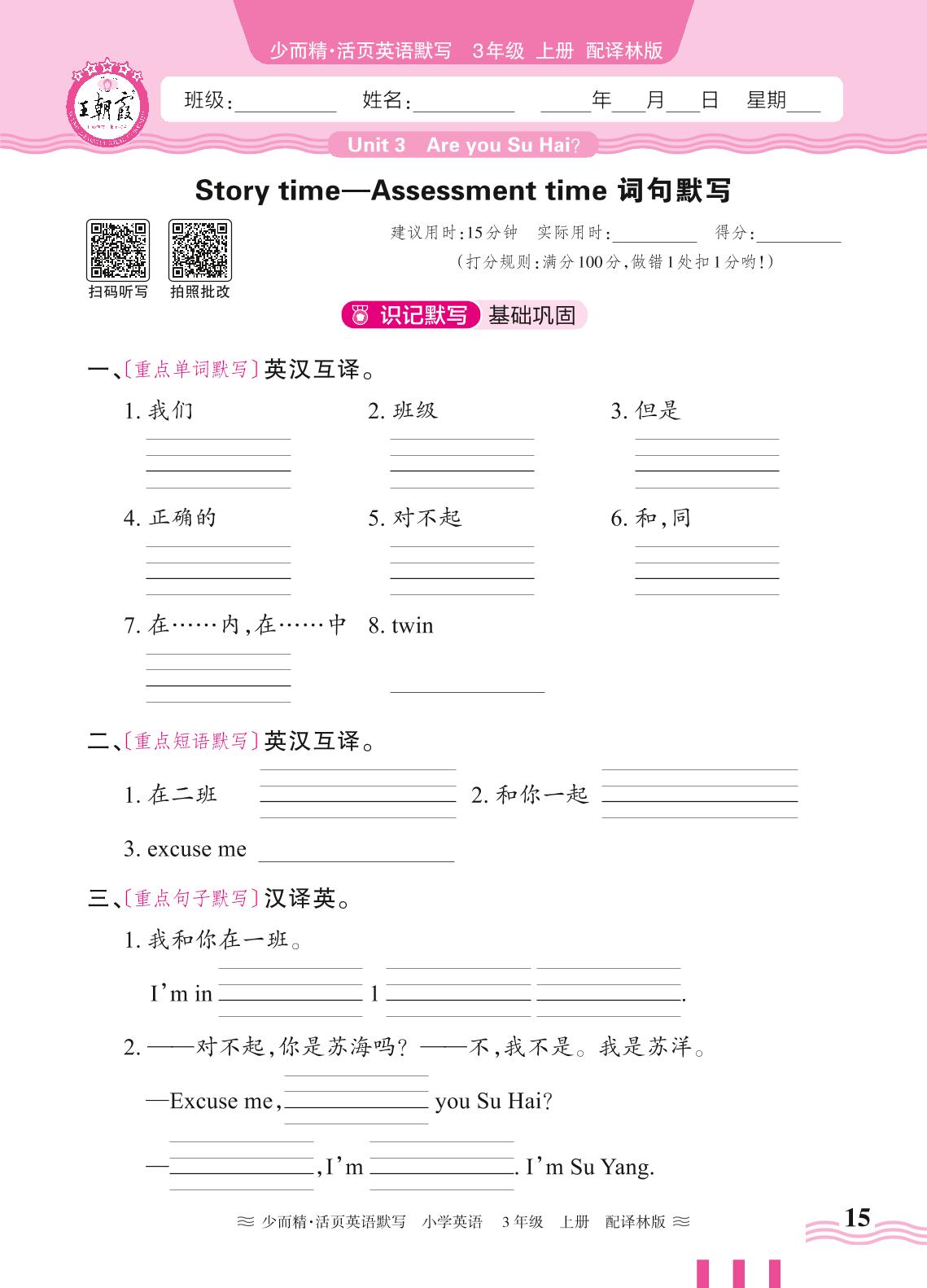 2024秋上册三年级英语译林版(三起始) Unit 3 Story time—Assessment time词句默写