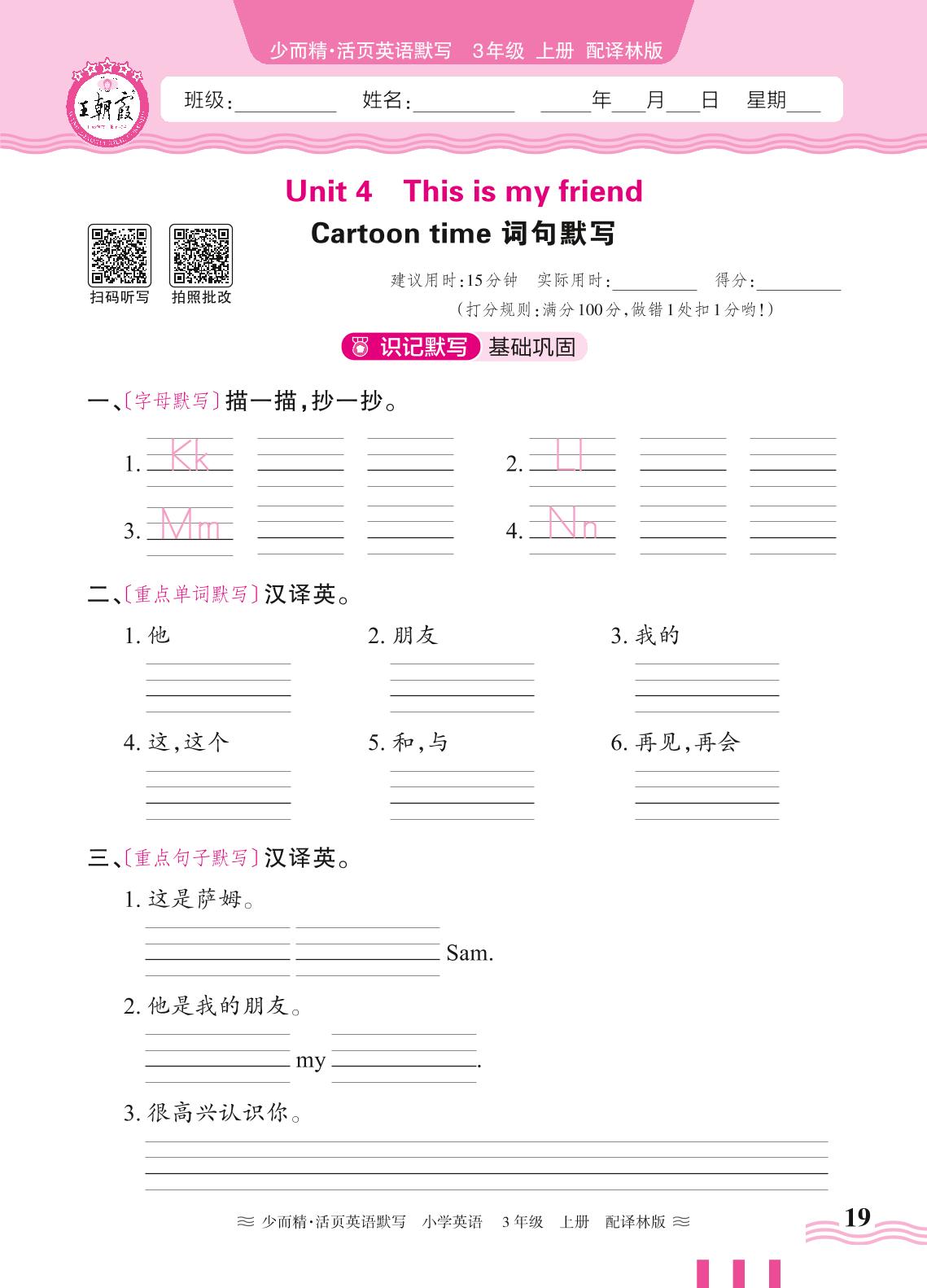 2024秋上册三年级英语译林版(三起始) Unit 4 Cartoon time词句默写