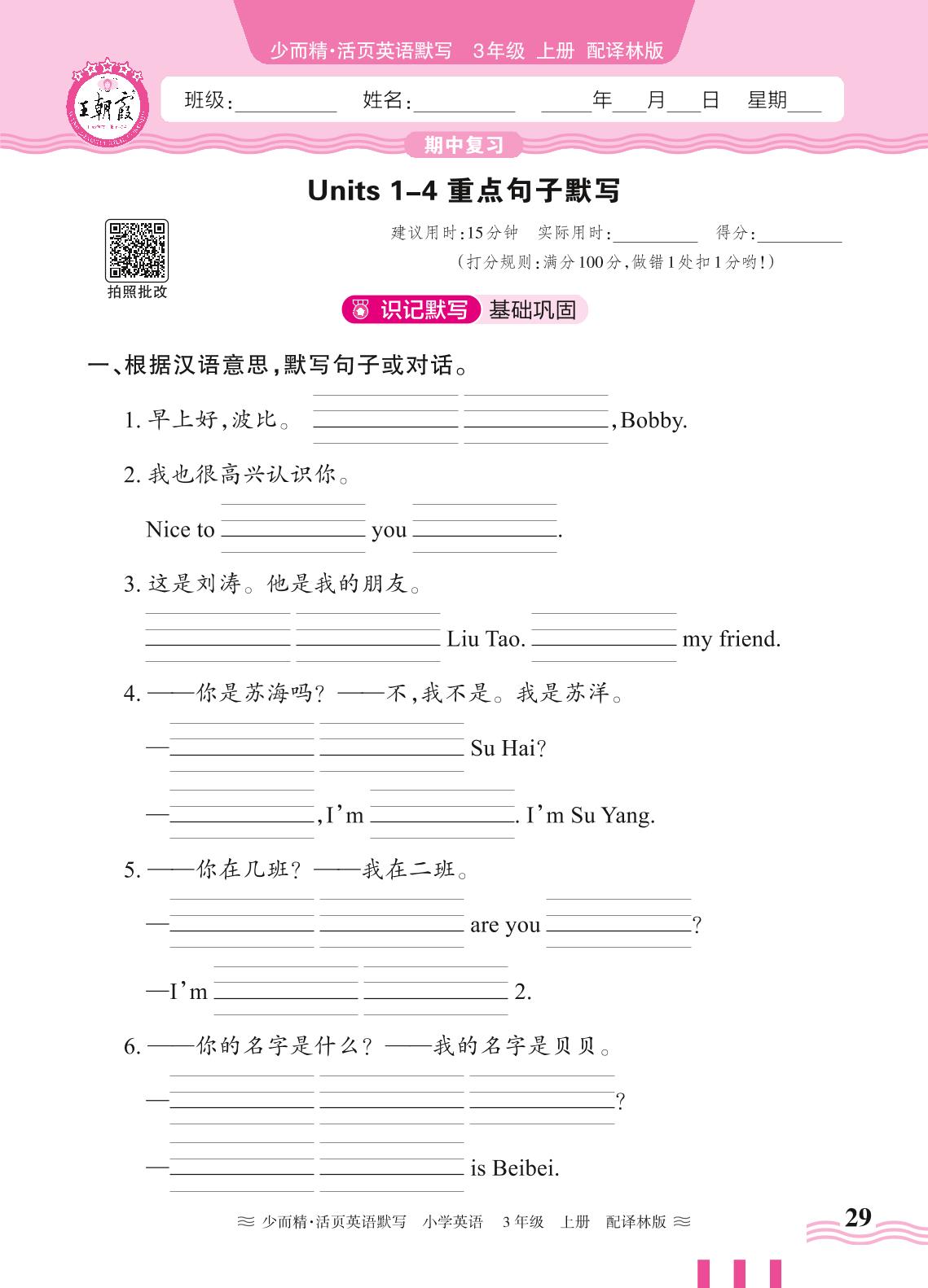 2024秋上册三年级英语译林版(三起始) 期中复习 Units 1-4 重点句子默写
