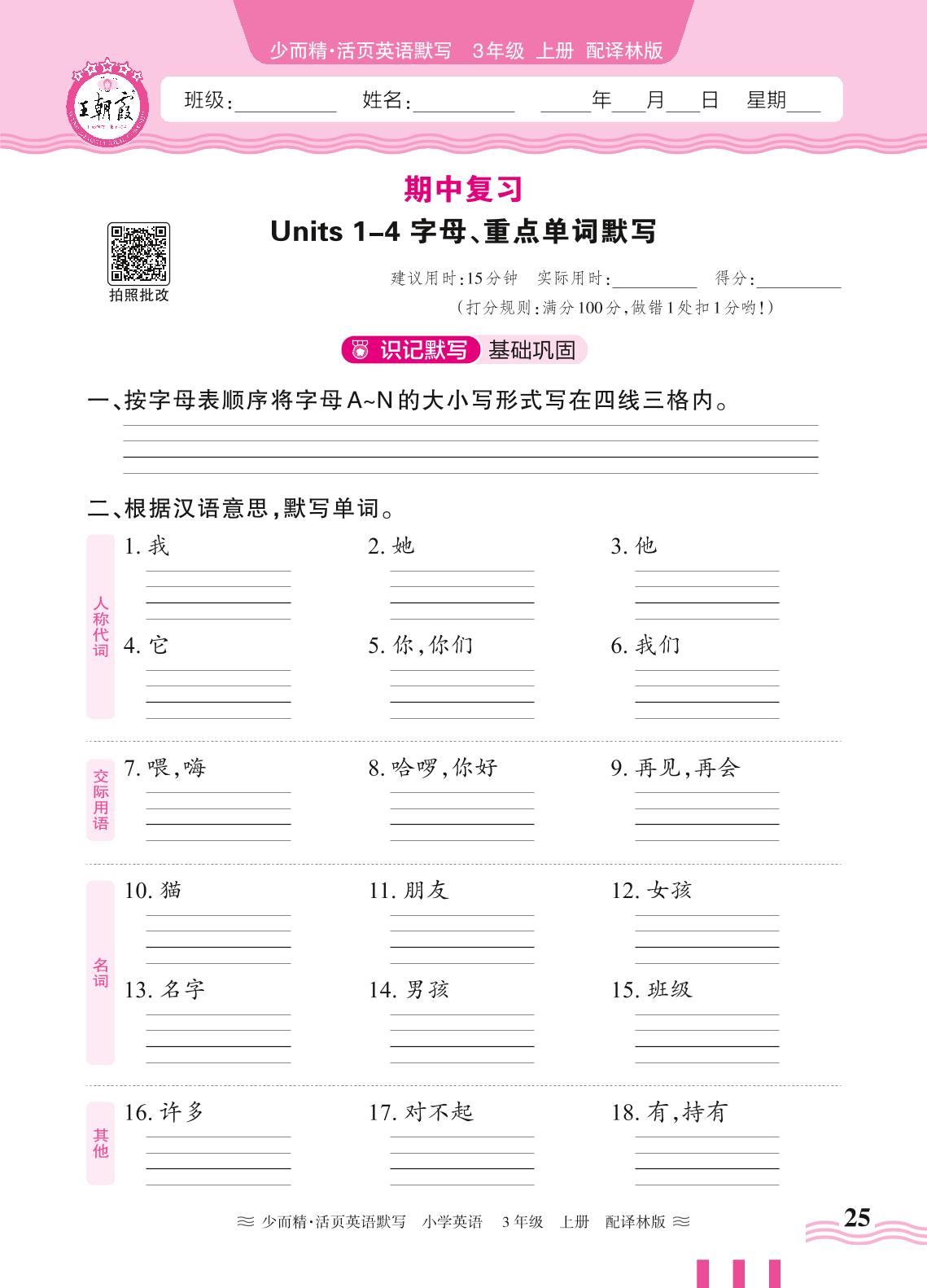 2024秋上册三年级英语译林版(三起始) 期中复习 Units 1-4 字母、重点单词默写