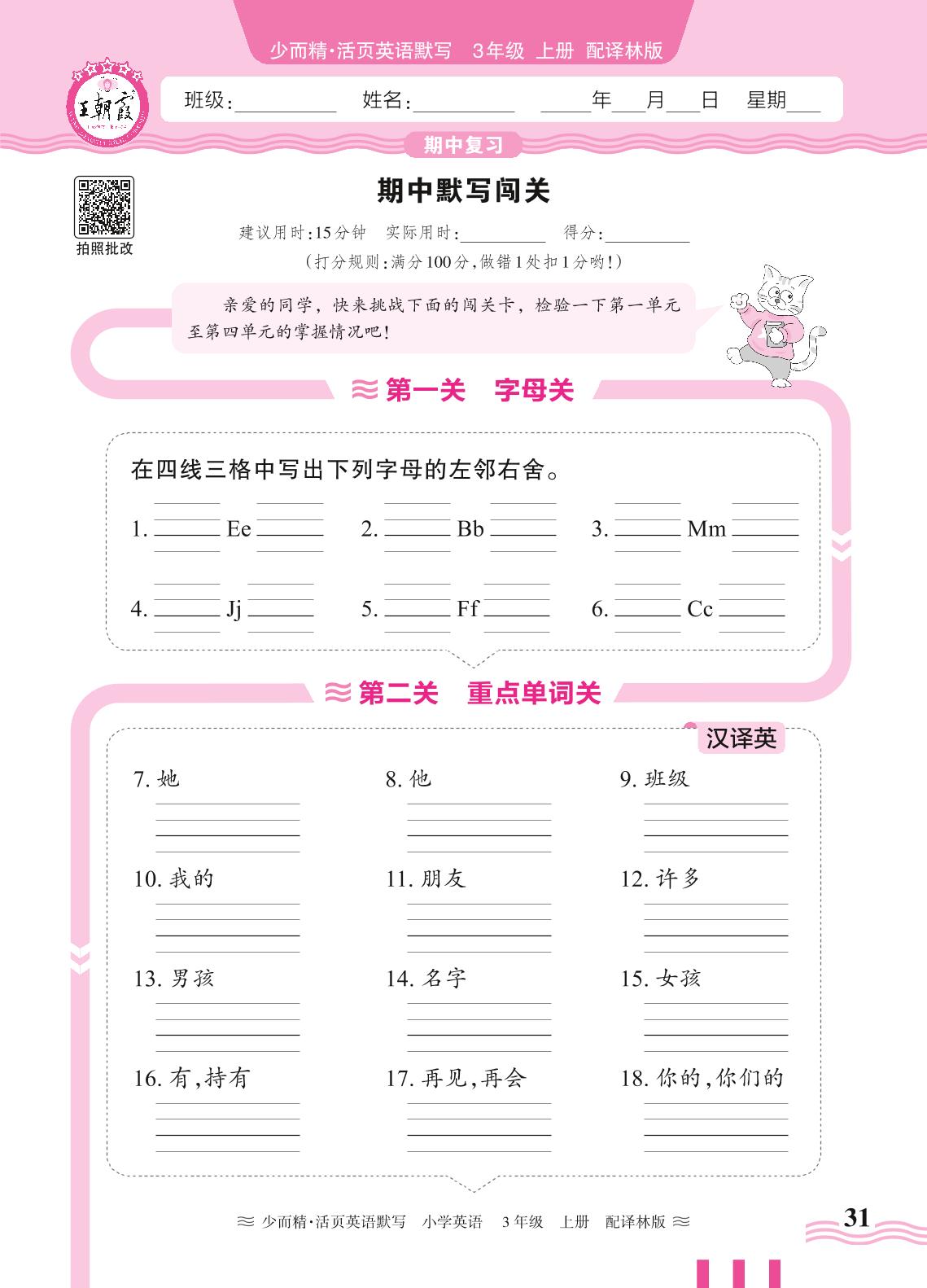 2024秋上册三年级英语译林版(三起始) 期中默写闯关