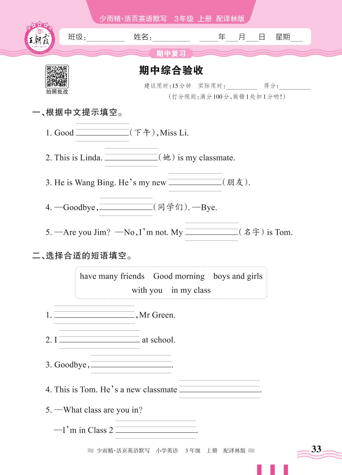 2024秋上册三年级英语译林版(三起始) 期中综合验收(默写专练)