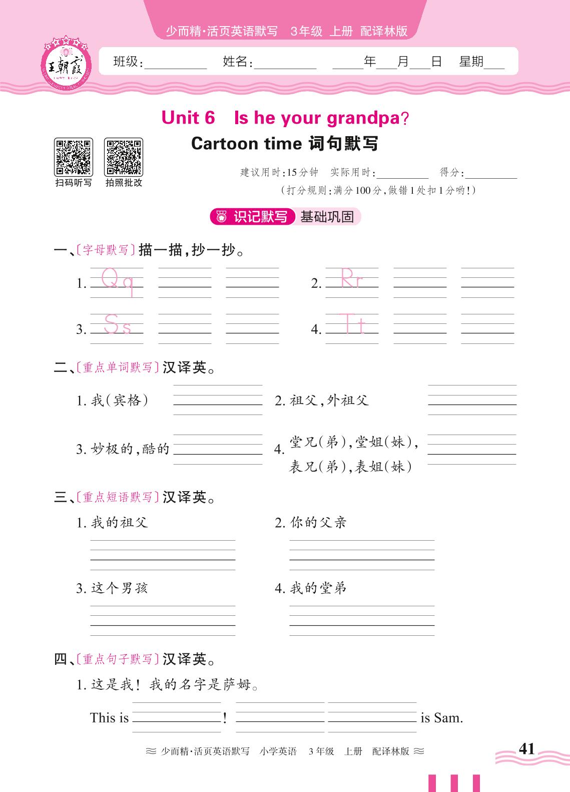 2024秋上册三年级英语译林版(三起始) Unit 6 Cartoon time词句默写