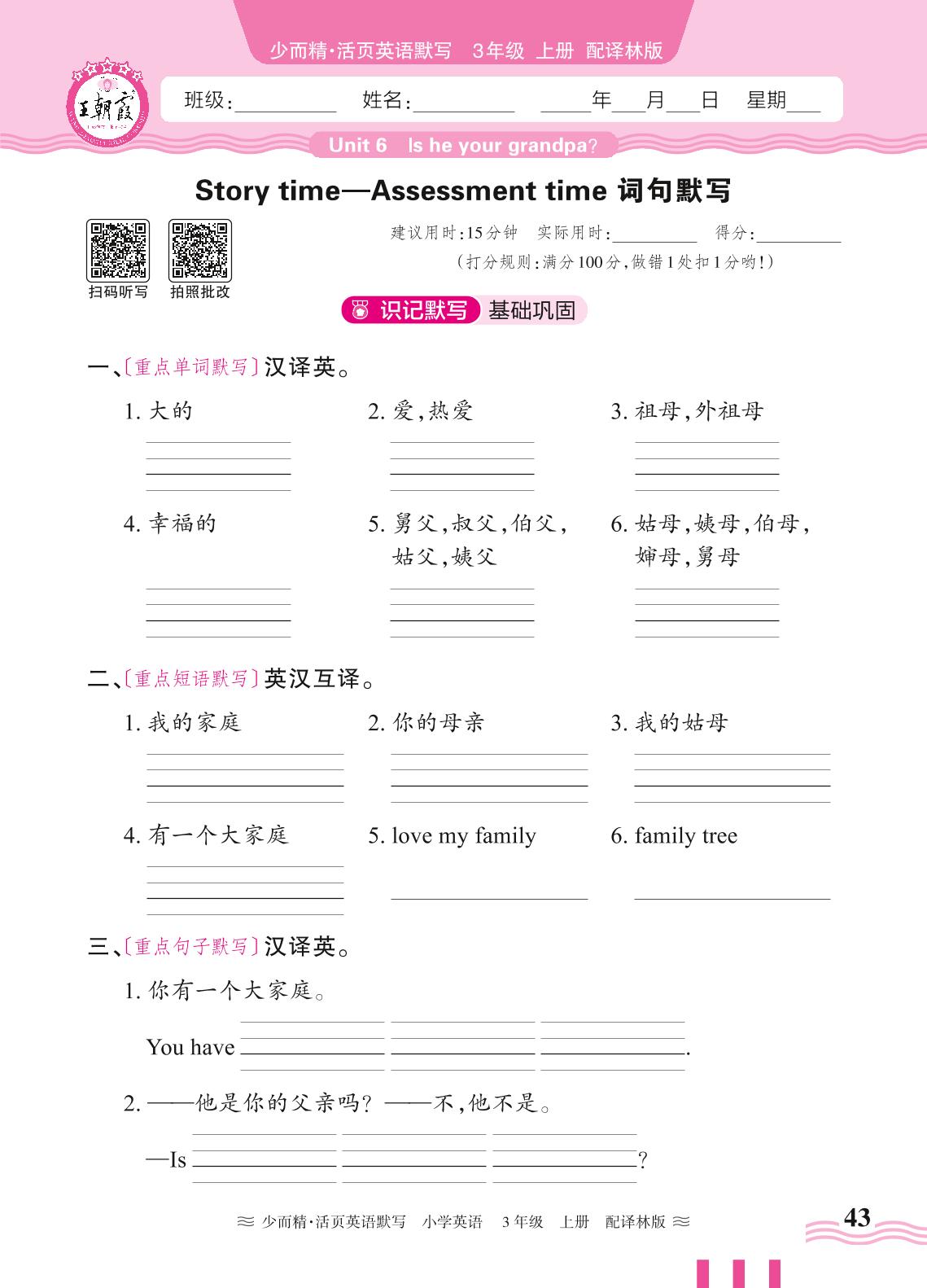 2024秋上册三年级英语译林版(三起始) Unit 6 Story time—Assessment time词句默写