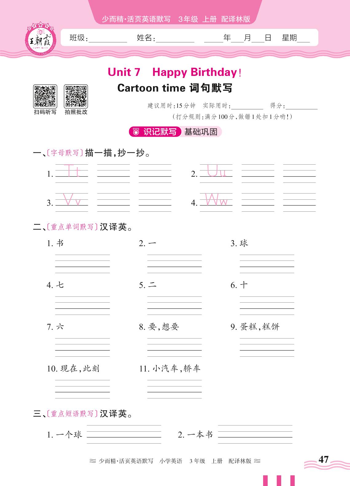2024秋上册三年级英语译林版(三起始) Unit 7 Cartoon time词句默写