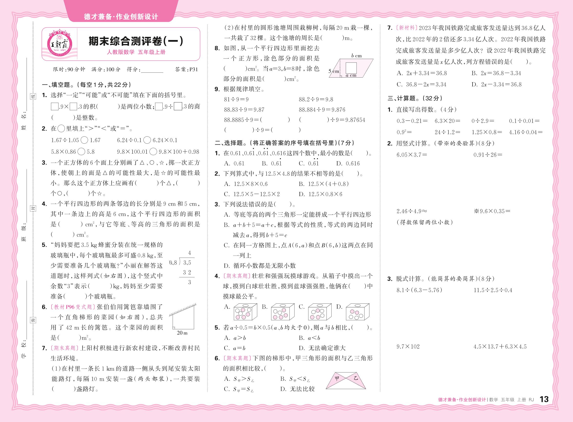 2024秋上册五年级数学人教版 期末综合测评卷(一)