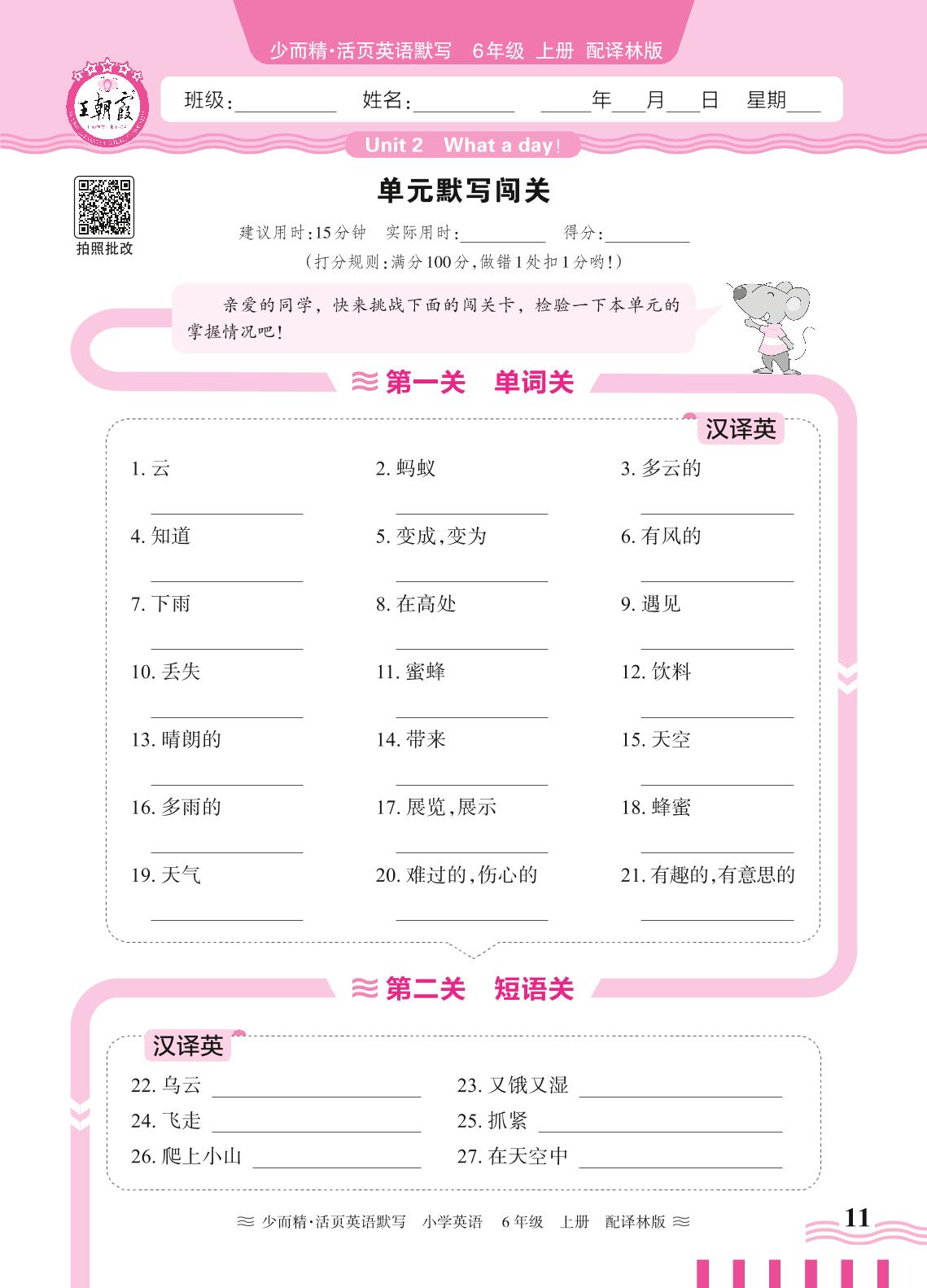 2024秋上册六年级英语译林版(三起始) Unit 2 单元默写闯关