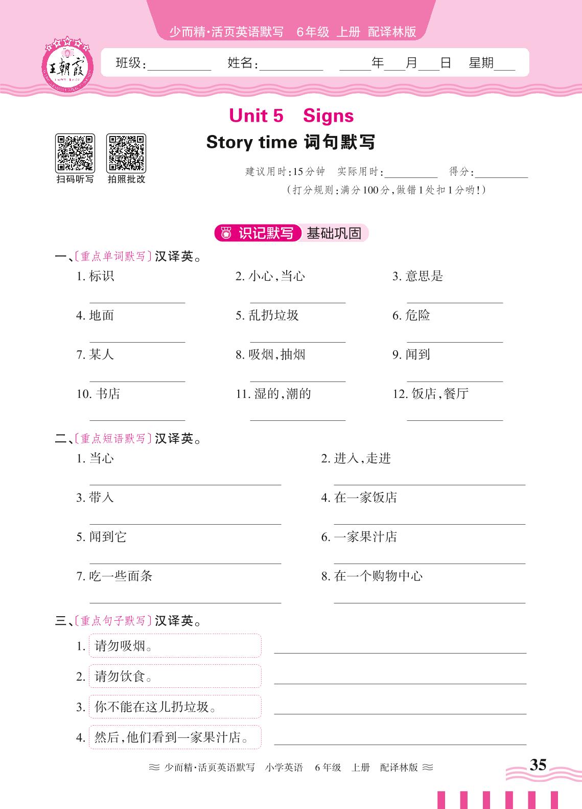 2024秋上册六年级英语译林版(三起始) Unit 5 Story time 词句默写