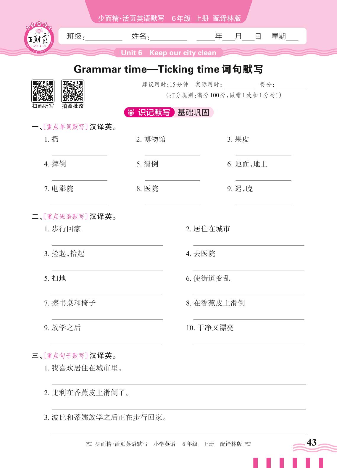 2024秋上册六年级英语译林版(三起始) Unit 6 Grammar time—Ticking time 词句默写