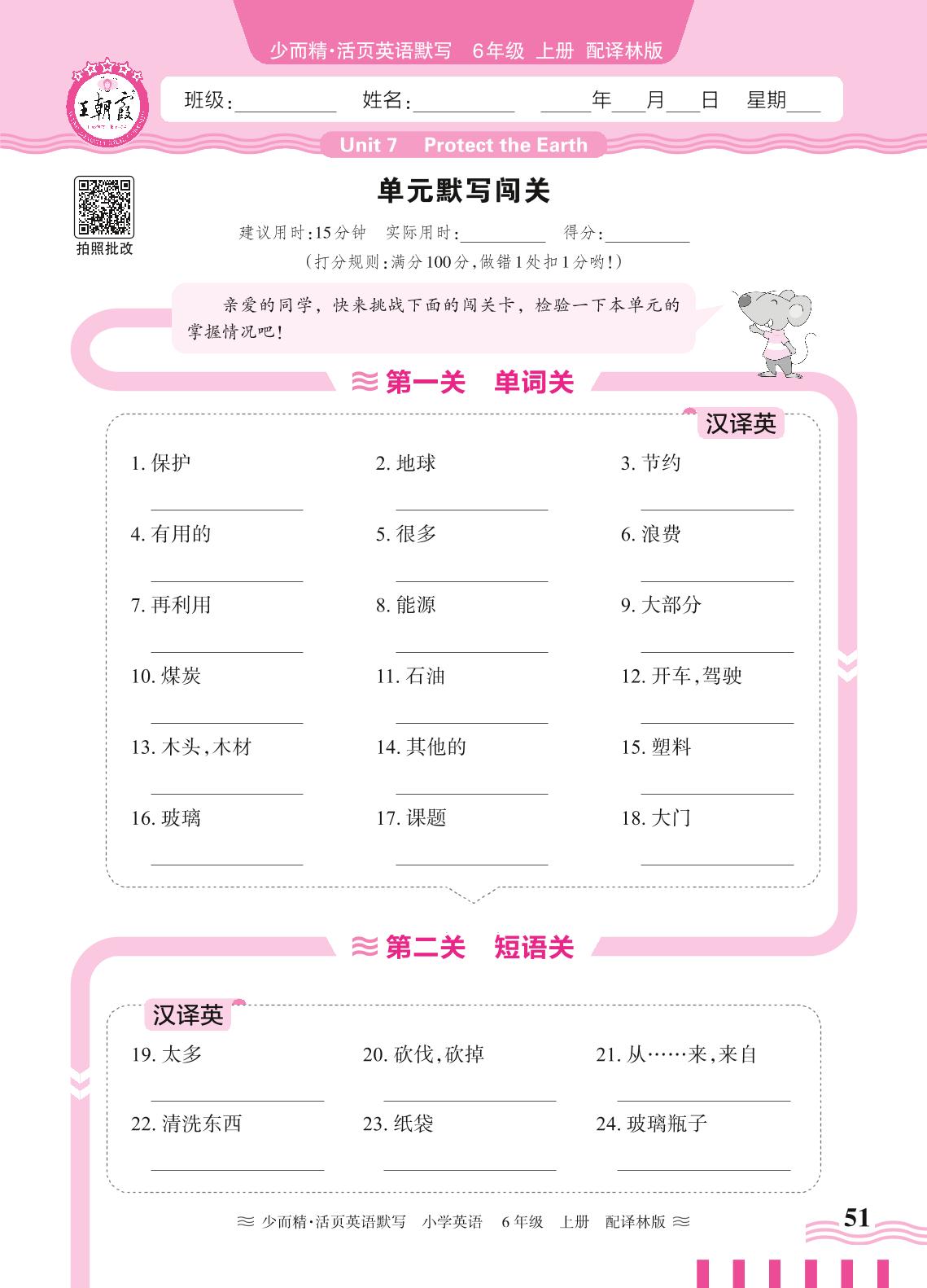 2024秋上册六年级英语译林版(三起始) Unit 7 单元默写闯关