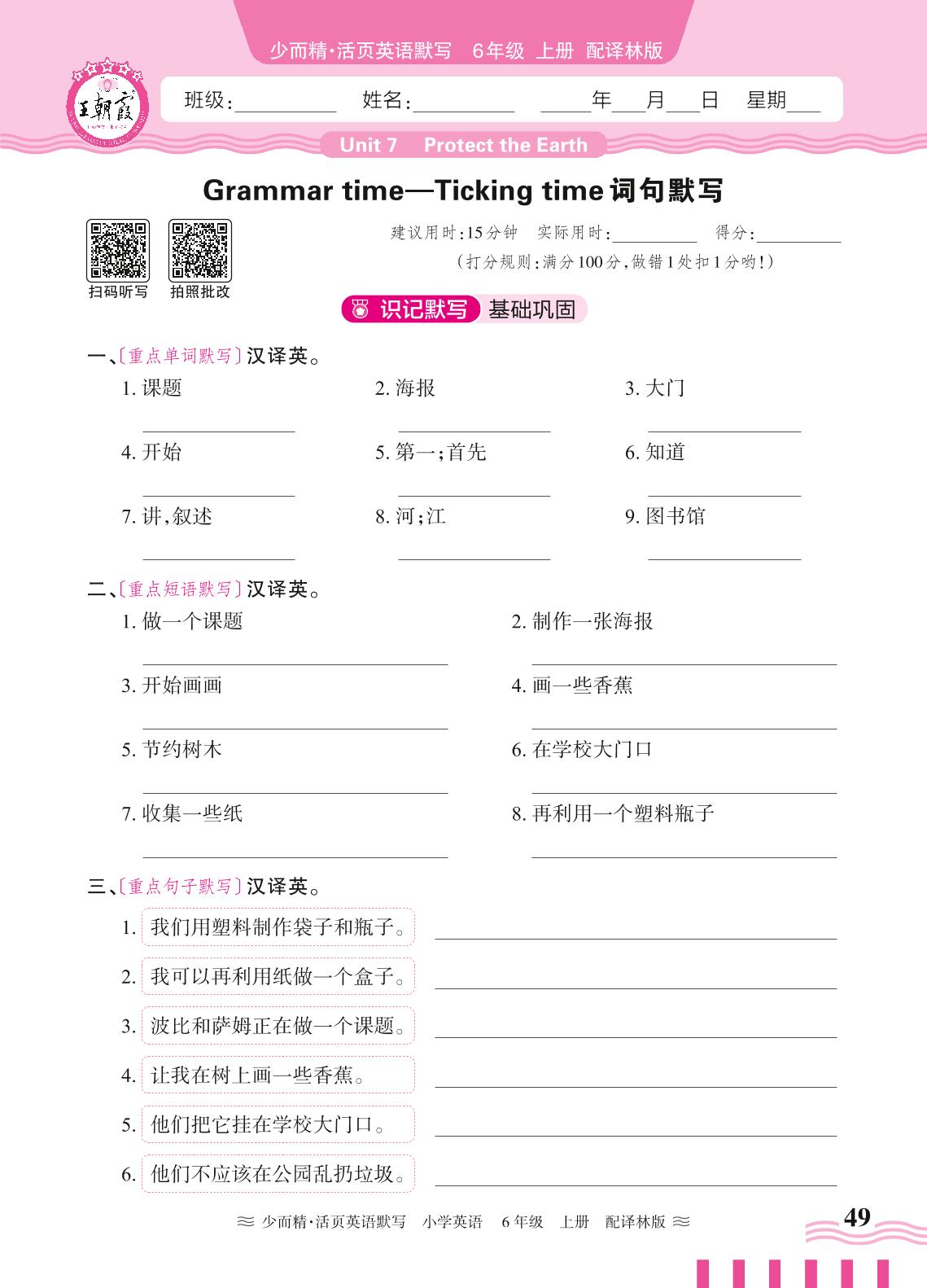 2024秋上册六年级英语译林版(三起始) Unit 7 Grammar time—Ticking time 词句默写