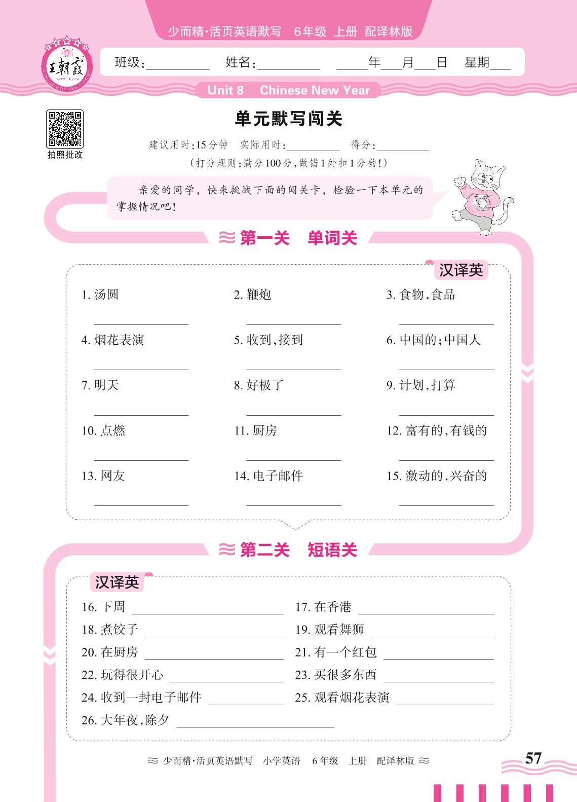 2024秋上册六年级英语译林版(三起始) Unit 8 单元默写闯关