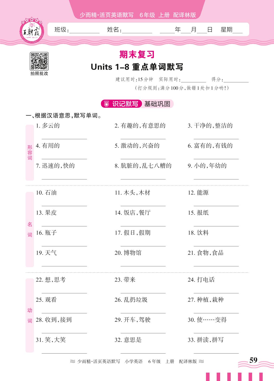 2024秋上册六年级英语译林版(三起始) Units 1-8 重点单词默写