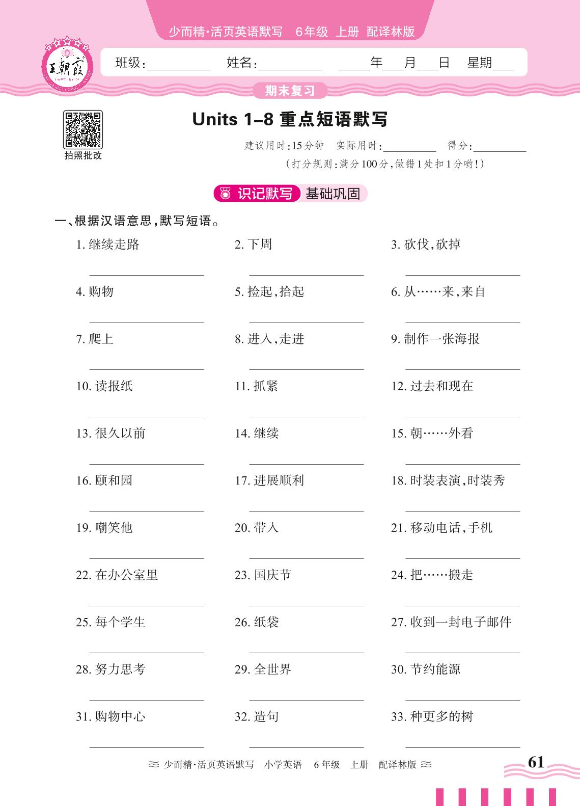 2024秋上册六年级英语译林版(三起始) Units 1-8 重点短语默写