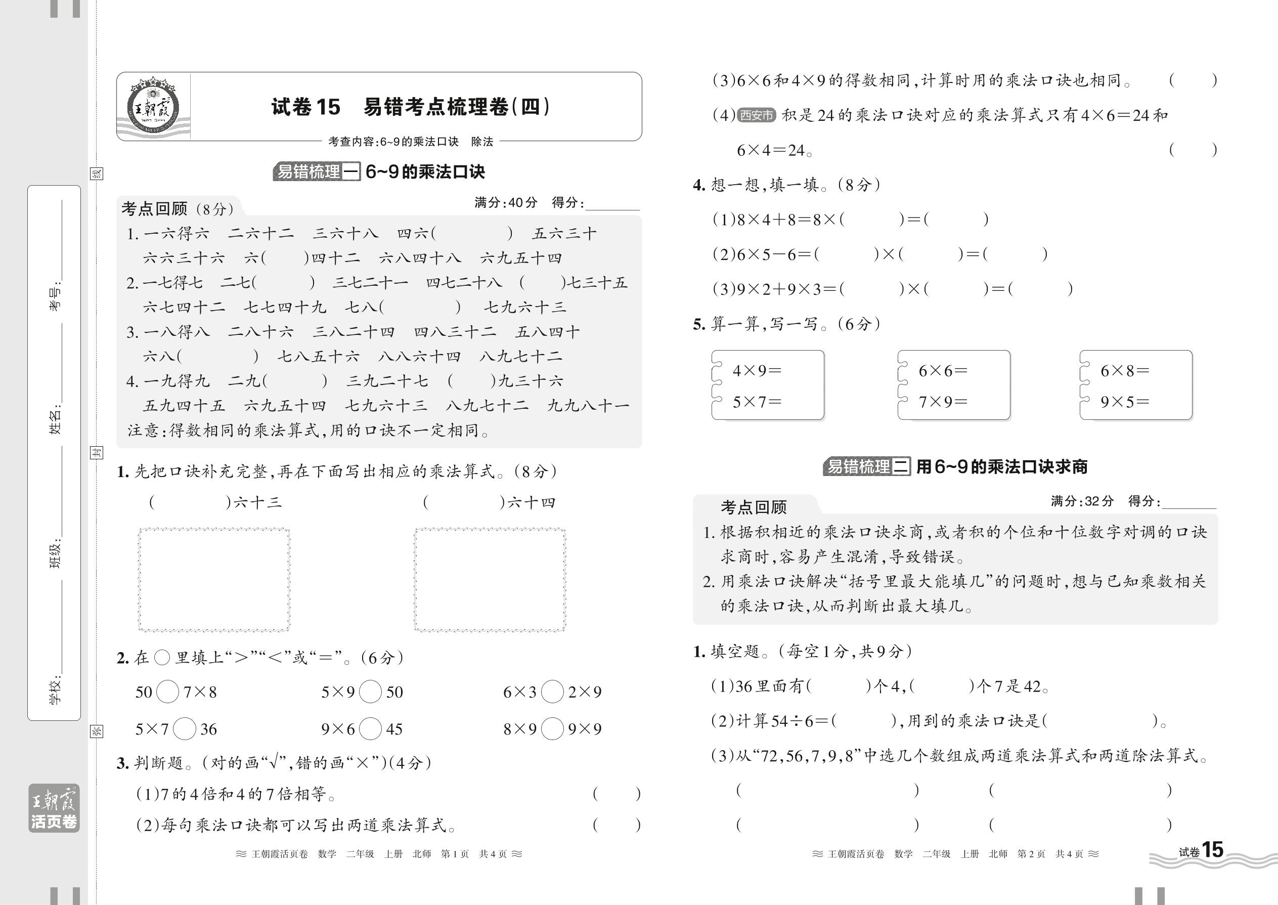 2024秋上册二年级数学北师版 易错考点梳理卷——6~9的乘法口诀 除法【15】