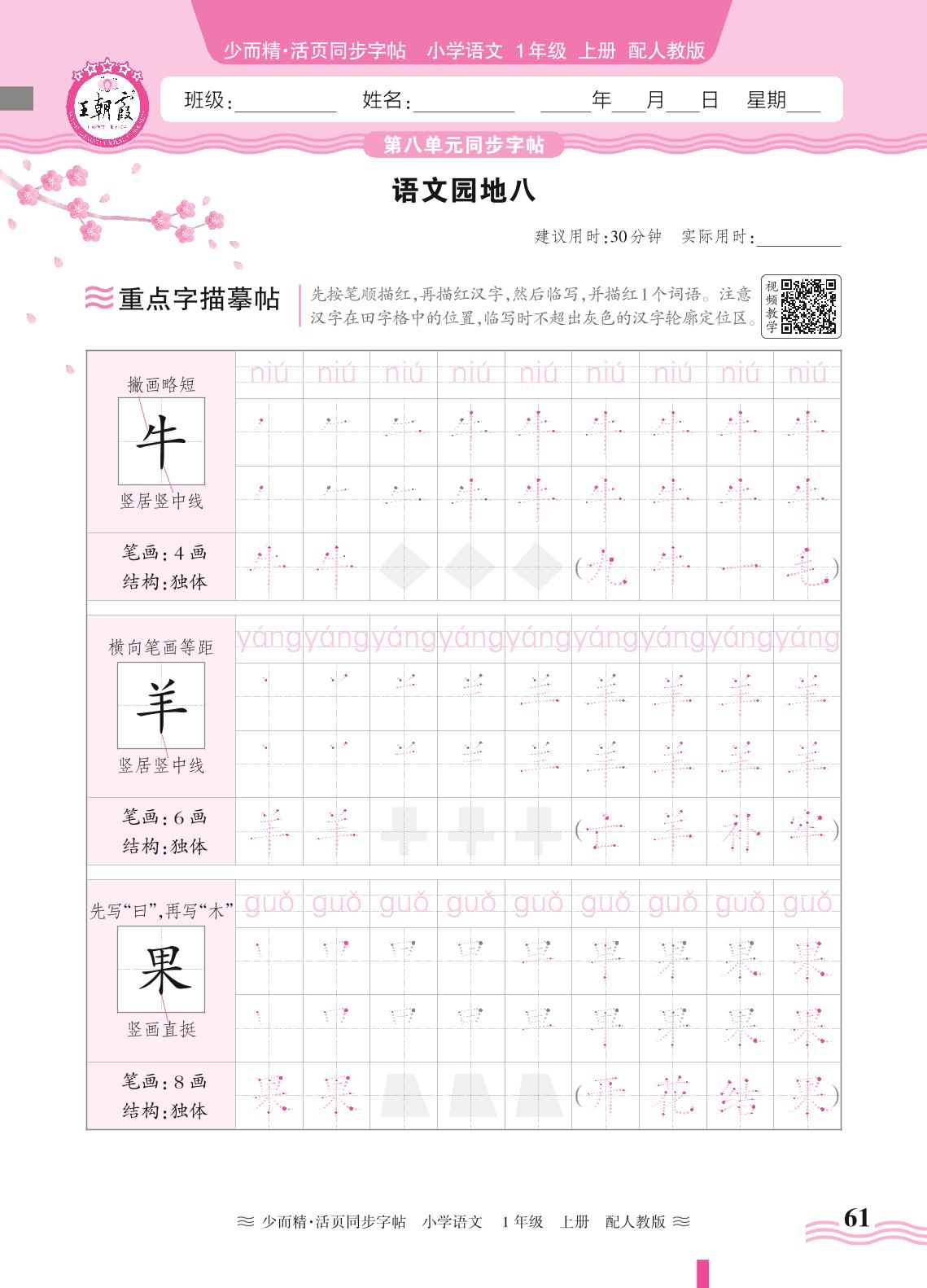 2024秋上册一年级语文人教版 第八单元同步字帖——语文园地八