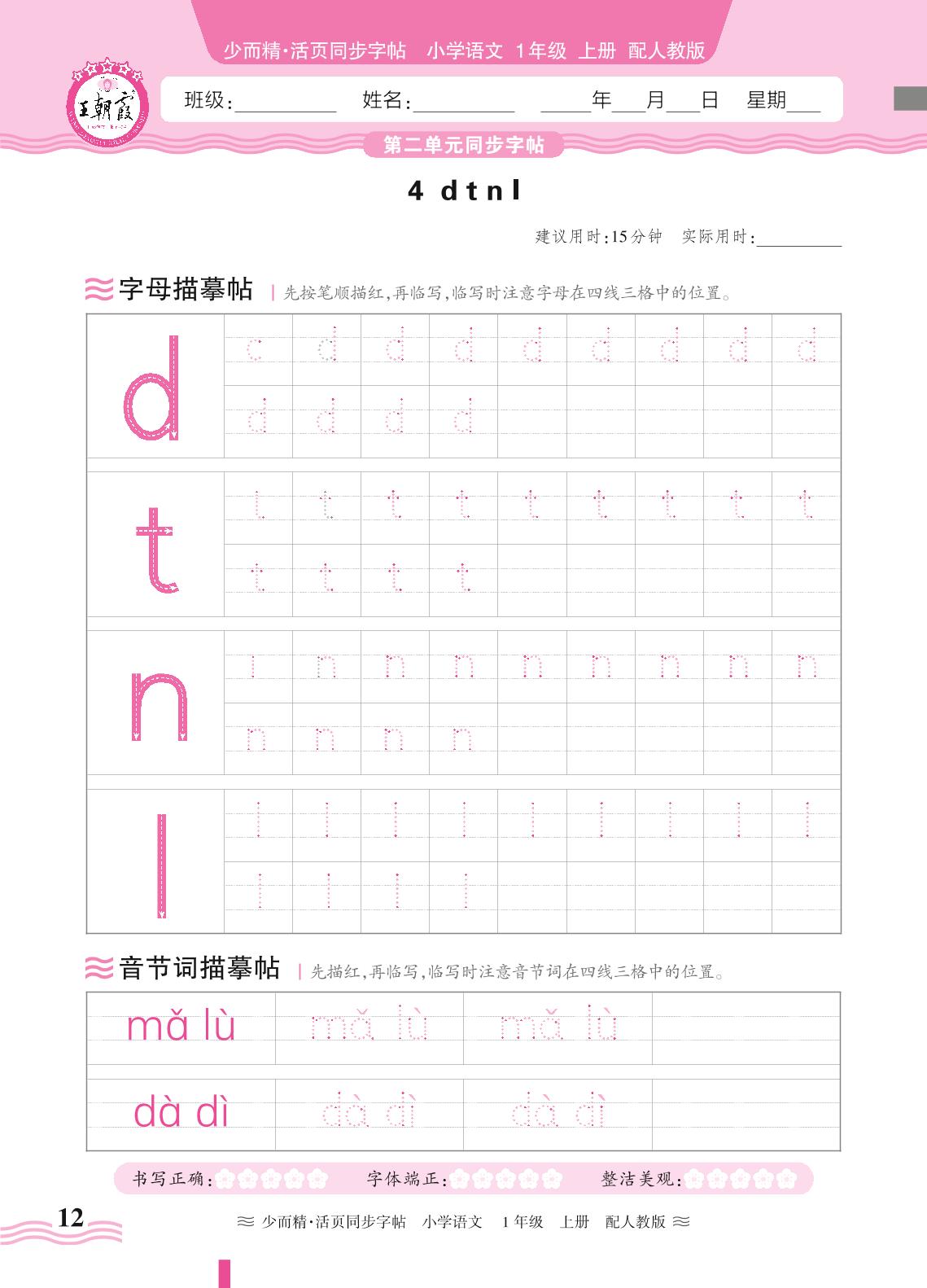 2024秋上册一年级语文人教版 第二单元同步字帖——4. d t n l