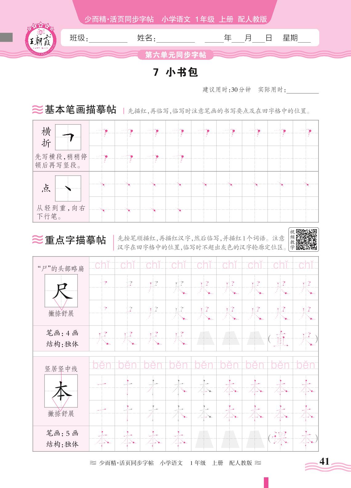 2024秋上册一年级语文人教版 第六单元同步字帖——7. 小书包
