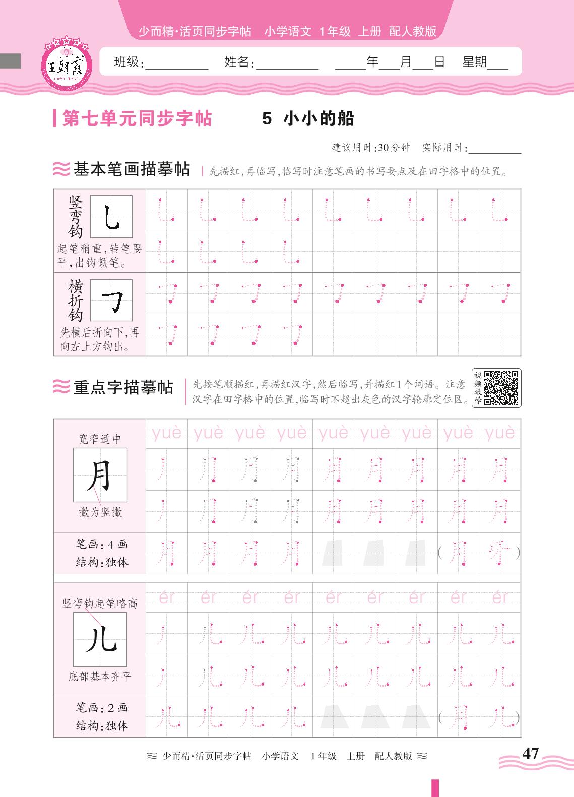 2024秋上册一年级语文人教版 第七单元同步字帖——5. 小小的船