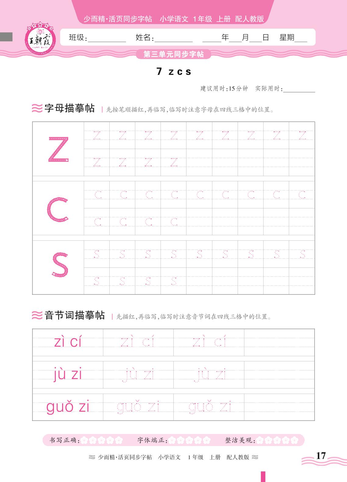 2024秋上册一年级语文人教版 第三单元同步字帖——7. z c s