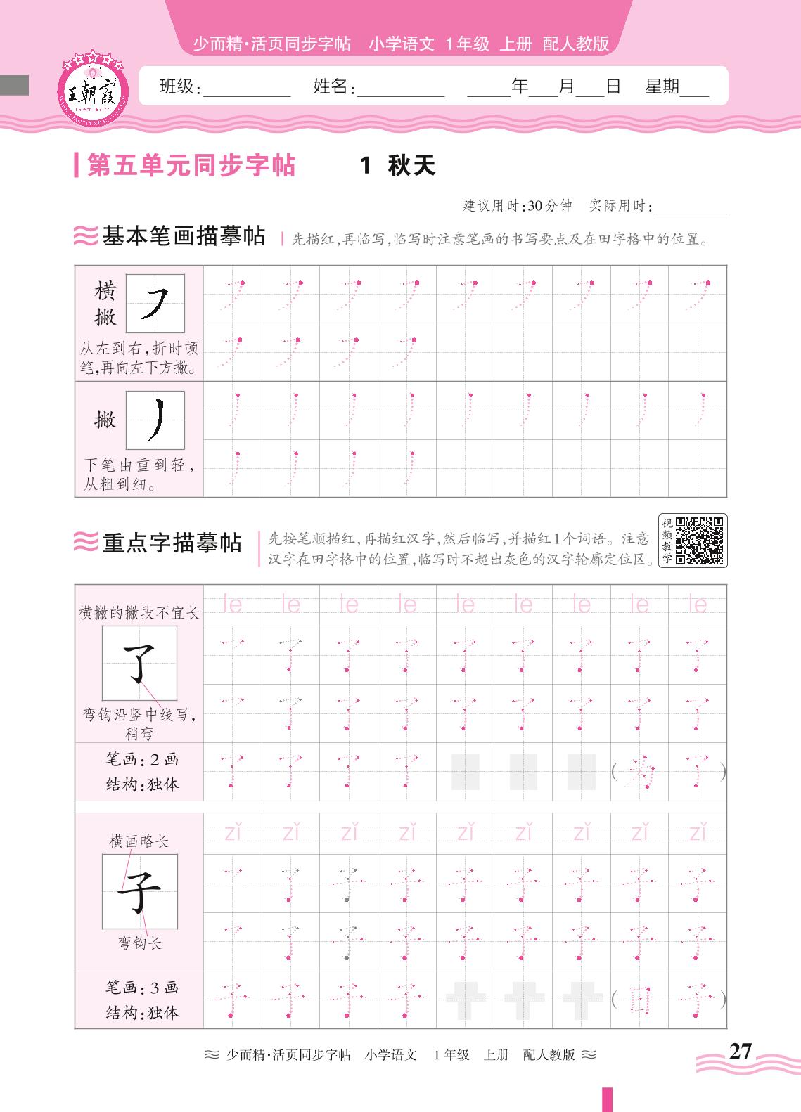2024秋上册一年级语文人教版 第五单元同步字帖——1. 秋天